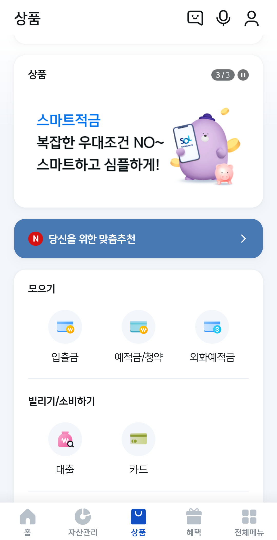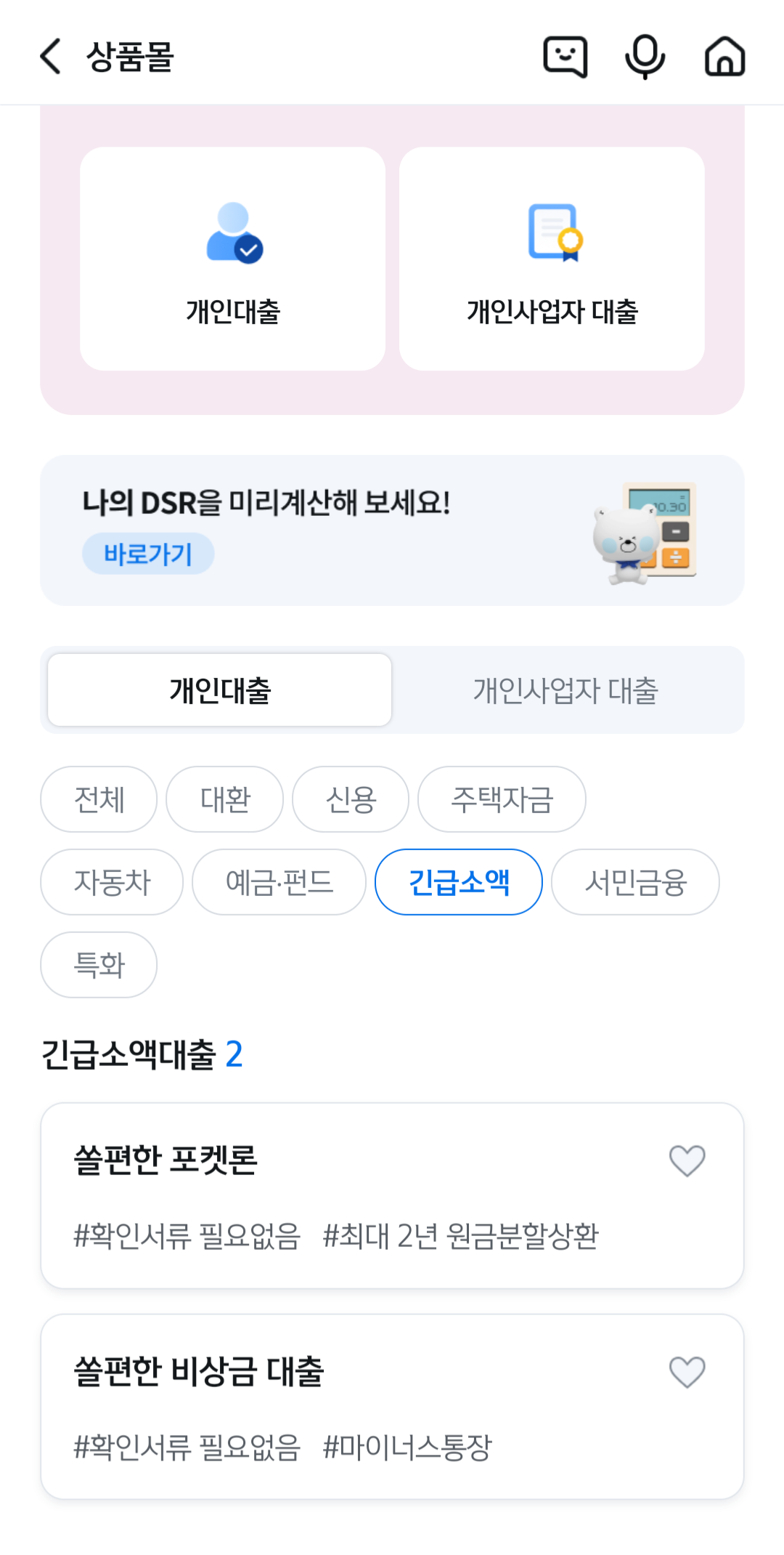 먼저 쏠뱅크 로그인 후 상품-대출-긴급소액-쏠편한 비상금 대출로 들어간다.