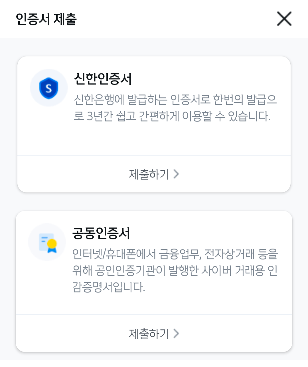 그런 다음 신한인증서나 공동인증서를 제출한다. 없으면 여기서 휴대폰 인증, 계좌 인증 등을 거쳐 바로 신한인증서를 발급받을 수 있는데, 다 만들고 나면 다시 처음 단계로 돌아가버리니 미리 인증서를 만드는걸 추천한다.