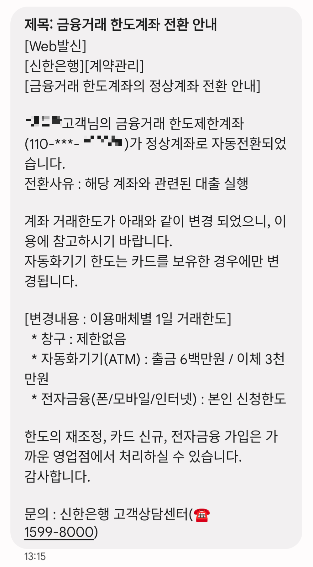 잠시만 기다리면 바로 대출 실행 사유로 한도제한 계좌가 정상계좌로 전환되었다는 문자가 날라온다. 만약 문자를 못받았다면 계좌 정보에서 [한도제한계좌1/2]라는 문구가 사라졌는지 확인하면 된다.