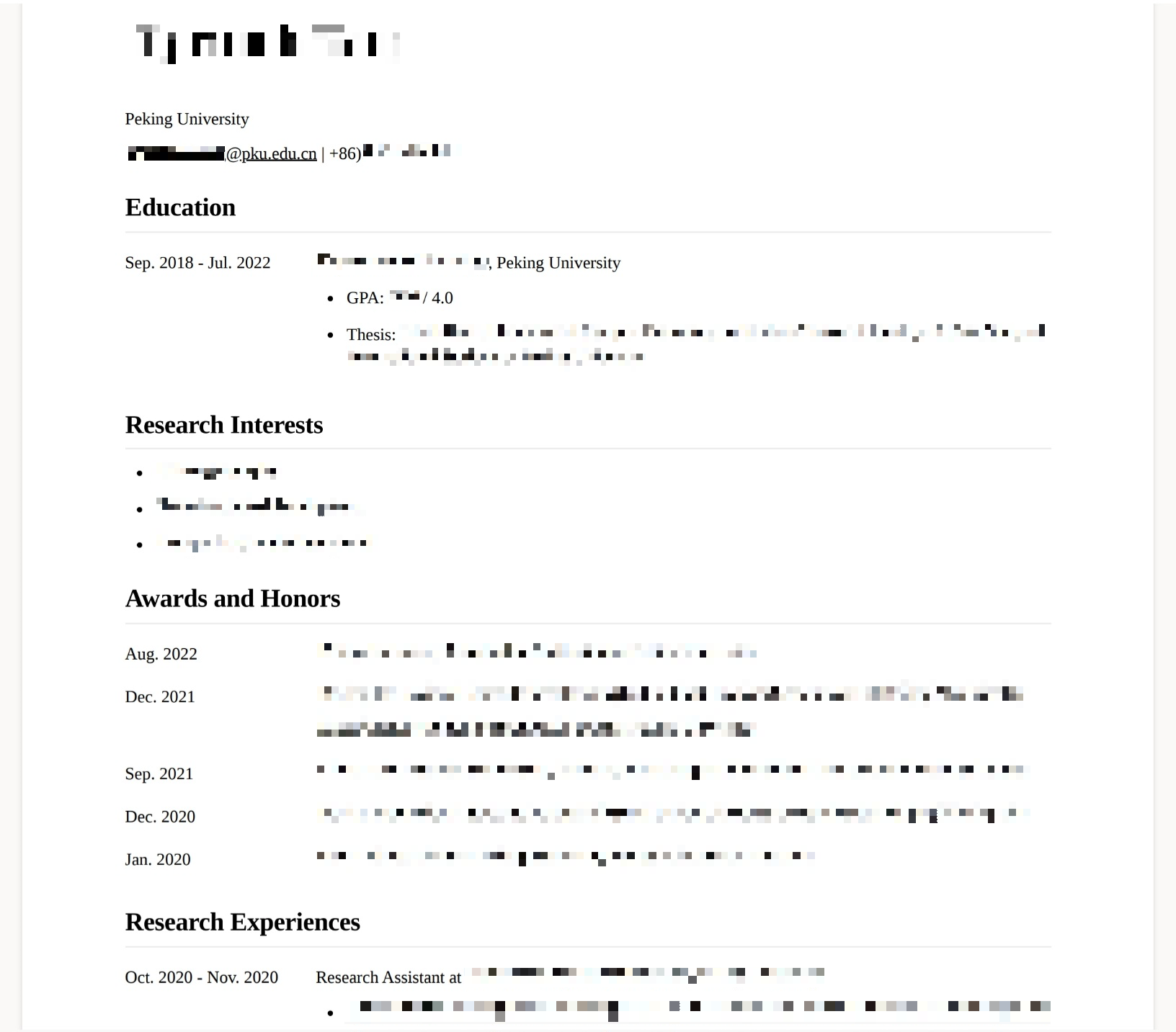 내가 그동안 어떤 연구를 해왔고, 어떤 상을 받아왔고, 학부 성적은 어땠는지를 일일이 나열하면 메일이 쓸데없이 길어지므로, 컨택 메일에는 CV와 성적표를 첨부하는게 일반적이다. CV는 굳이 중국어로 쓸 필요 없이 영어로 써도 교수님들은 읽으시고, "나는 중국어 말고 영어 실력도 문제가 없다"는 점을 전달하는 효과도 있다.