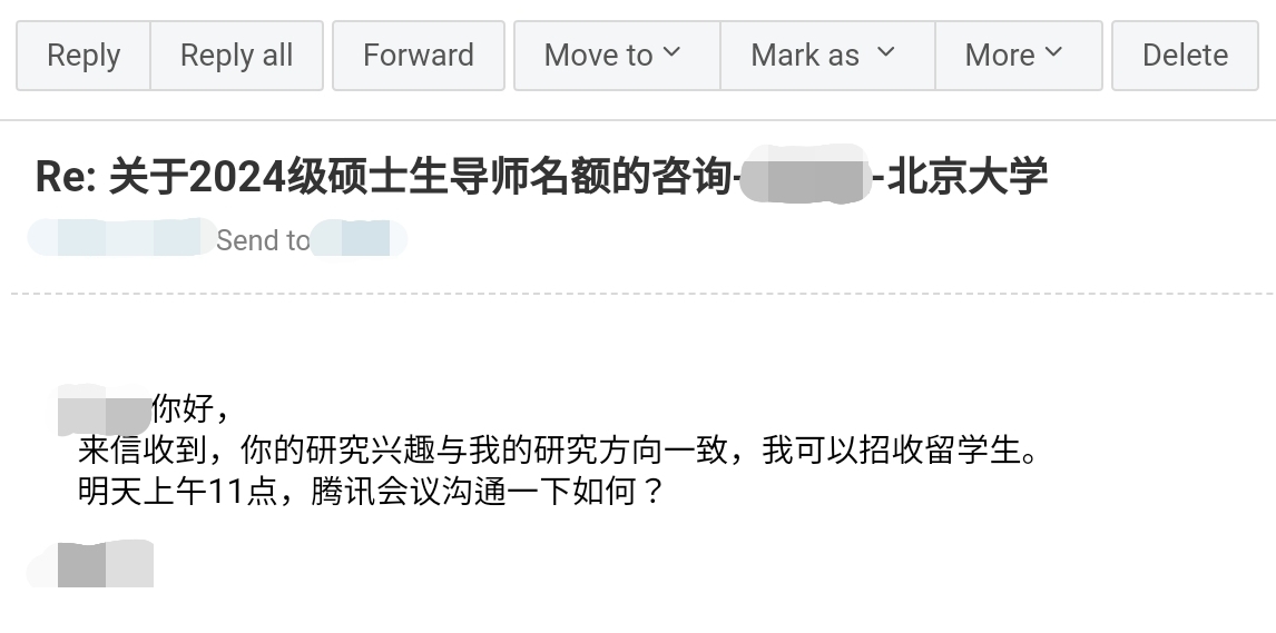 어느 교수님을 가장 지도교수로 삼고 싶은지 결정했다면 이제 메일을 보내 학생으로 받아드릴 의향이 있으신지 물어볼 차례다. 컨택 메일을 중국에서는 套磁信이라고 부르는데, 중국어로 된 컨택 메일 양식을 찾고자 한다면 추천서와 마찬가지로 중국 검색엔진에 保研 套磁信 模板이라고 검색하면 된다.