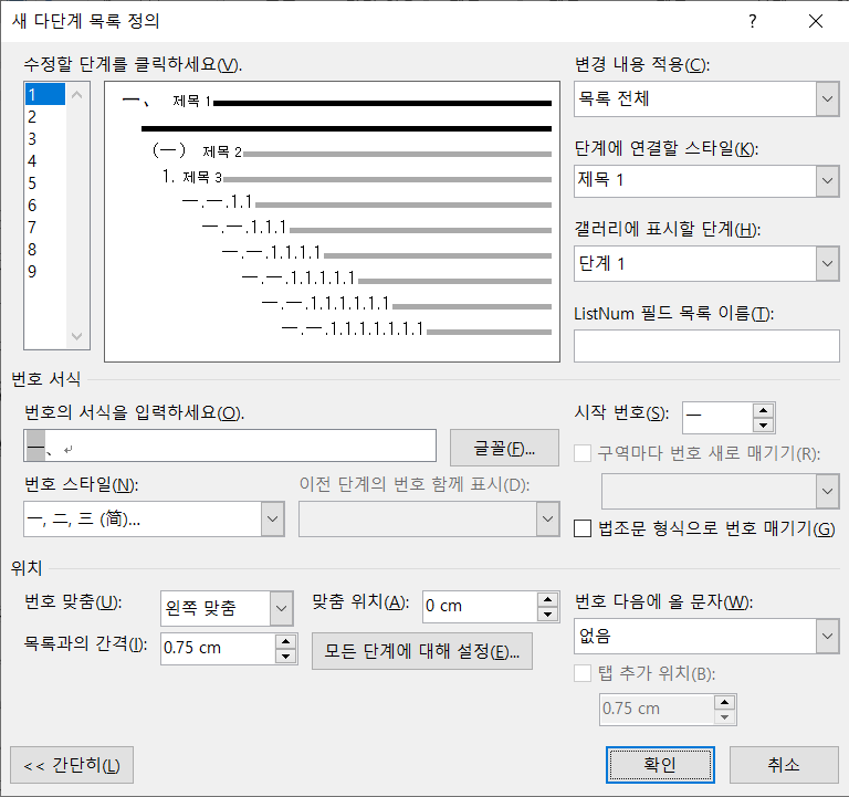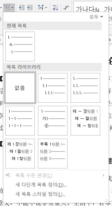 주의할 점은 저기 "단계별 연결할 스타일"이 다단계 목록 기능의 핵심인데, 즉 각 소제목에 제목 스타일이 연결돼있어야만 다단계 목록이 정상적이게 작동한다. 그니까 스타일 기능 제발 쓰자 두 번 쓰자 세 번 쓰자.