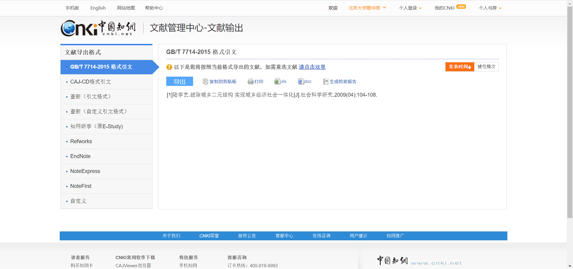 매번 일일이 대조하면서 출처를 적으려면 매우 불편했겠지만, 중국 대학생의 영원한 벗 Cnki(中国知网)에는 구글 학술처럼 인용 출처 표기를 한방에 해결해주는 기능이 있다.