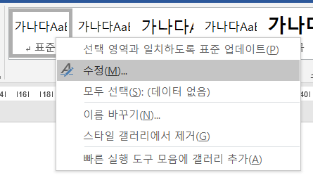 변경하고자 하는 스타일 (예를 들면 본문은 "표준", 1단계 소제목은 "제목 1" 이런 식)에 마우스 우클릭해 수정을 눌러서