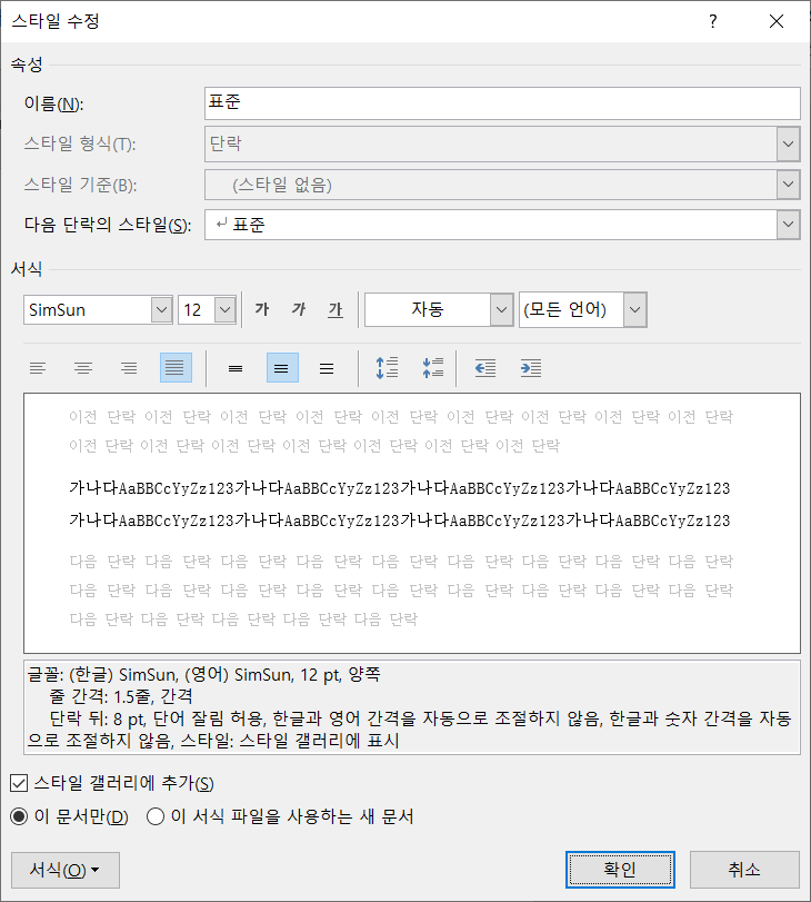 이렇게 논문 양식에 맞게 수정해두면 나중에 클릭 한 번으로 글꼴과 크기를 변경할 수 있다.
