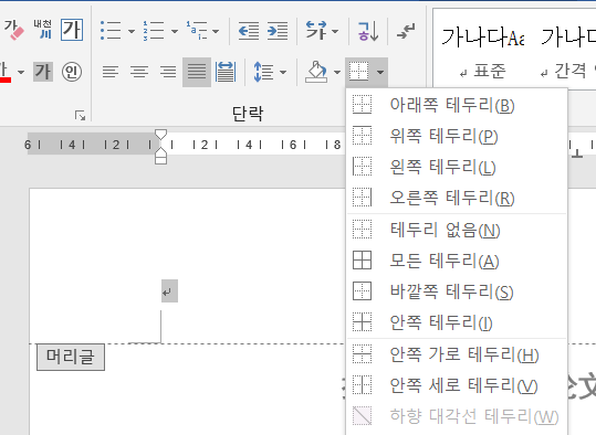 우선 머리글 부분과 본문 부분에 구분을 주기 위해서 문서 상단 부분 빈 공간을 두 번 클릭하고, 머리글 부분을 선택 한 다음 "아래쪽 테두리"를 선택한다.