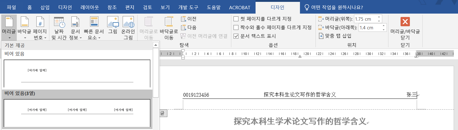학번과 이름도 기재하고 싶다면 디자인-머리글-비어 있음(3열)을 골라 저렇게 작성해도 된다.