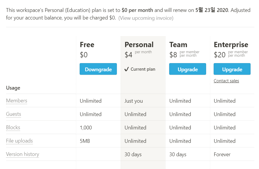 즉 기존 교육혜택 사용자들은 자동으로 Personal Pro로 업그레이드 된 셈.