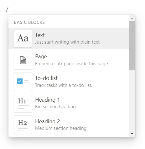 노션을 위키처럼 쓰면서 페이지 안에 페이지를 삽입하는것도 이 슬래시를 통해서 삽입하는것이다.