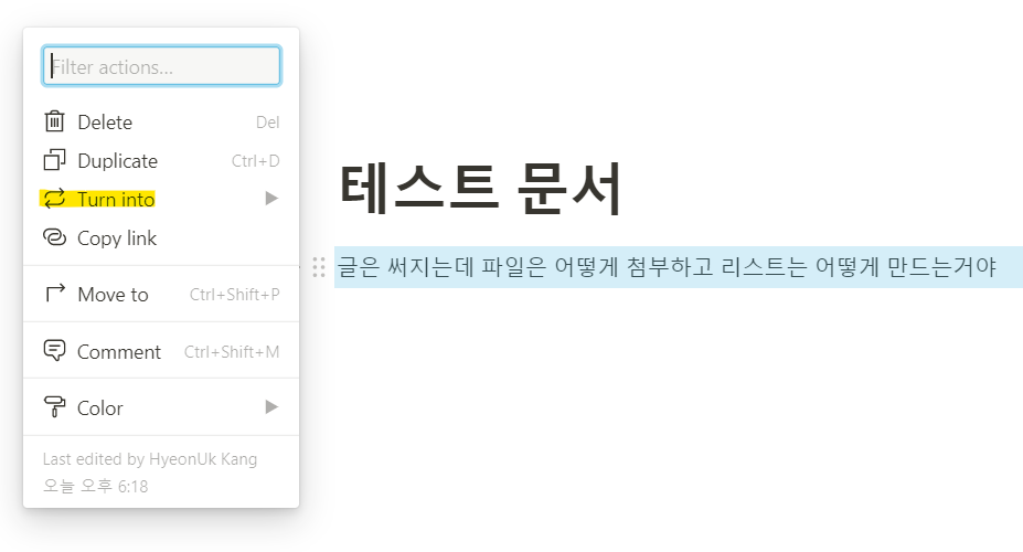 Turn into를 누르면 변환이 가능한 타입으로 변환이 가능하다.