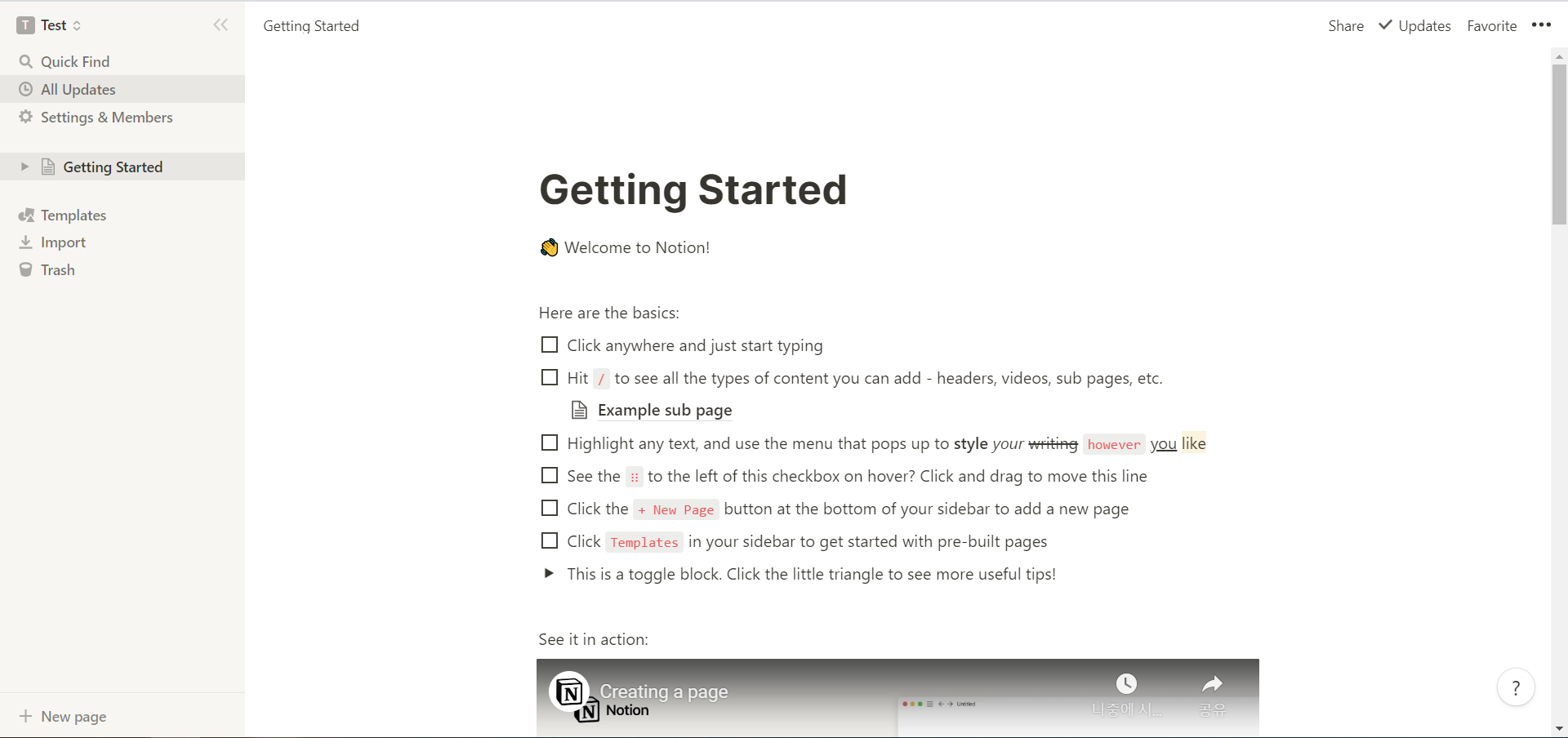 우선 노션의 기본적인 문서 보관 구조에 대해 알아놓으면 노션을 이해하는데 훨씬 수월하다.