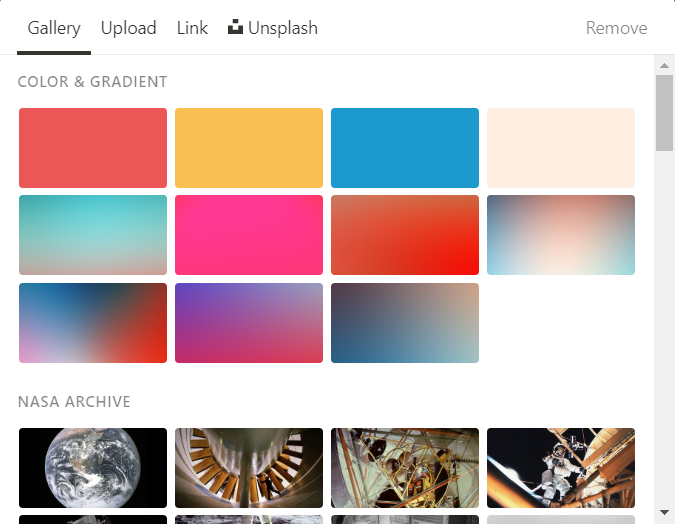 링크를 업로드하거나, 아니면 Unsplash에서 제공하는 사진을 검색해서 가져와 사용하는것도 가능하다.