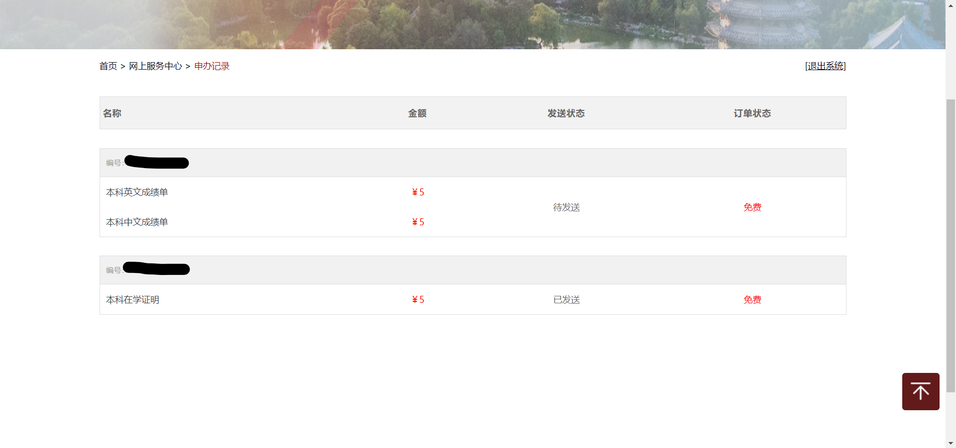 (방금전에 왼쪽 申办成绩单을 비추하는 이유가 마지막에 돈을 내라는 화면이 나온다...무려 장당 10위안...)