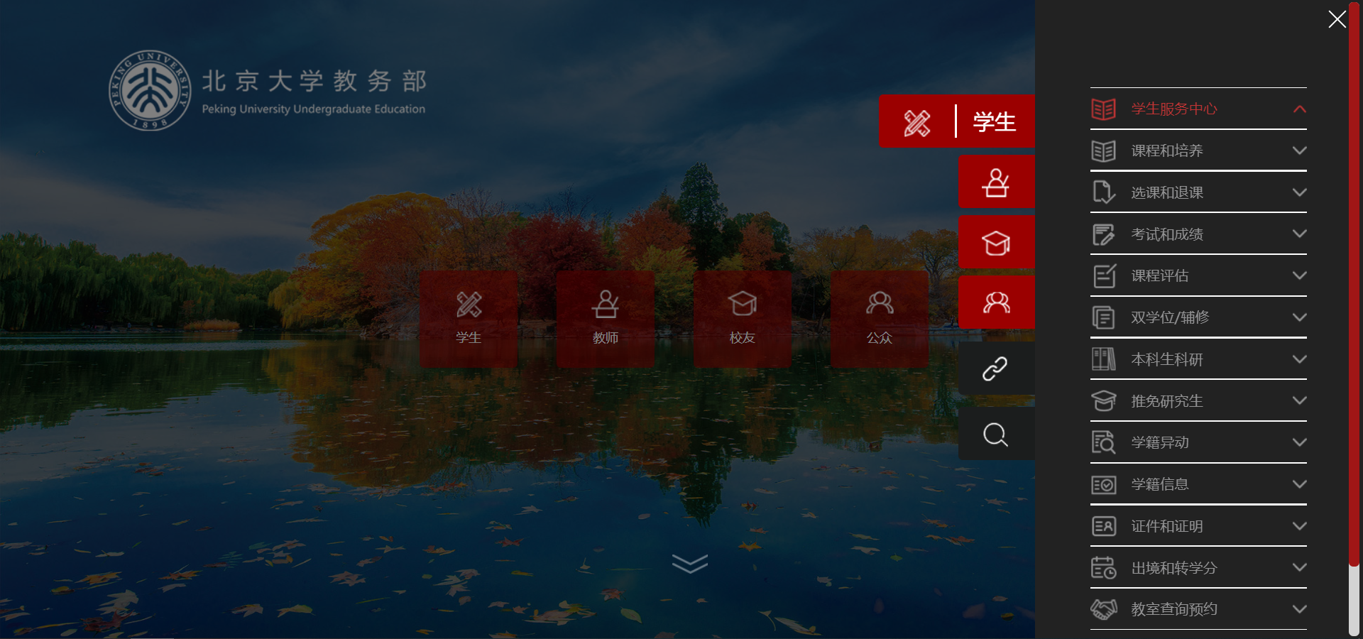 dean.pku.edu.cn에 들어가서 学生(학생)-学生服务中心(학생 서비스센터)을 누른다.
