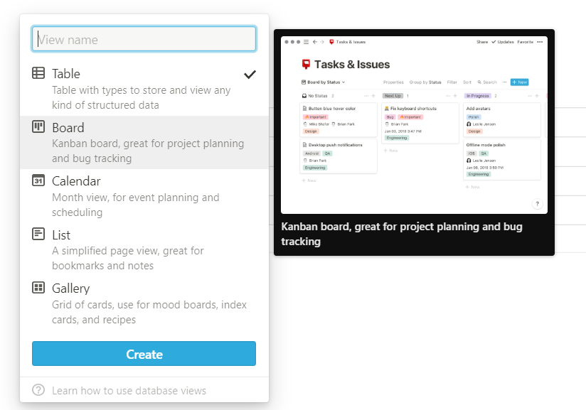 이외에도 Board(흔히들 Trello 칸반보드라고 하는것), Gallery, List, Calendar
