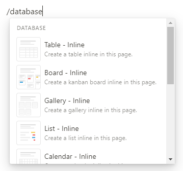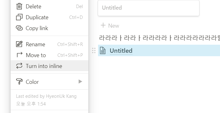 full page 데이터베이스의 경우 해당 페이지 링크 왼쪽 점 6개를 눌러 turn into inline을 누르면 페이지 내 삽입 형식으로 전환된다.