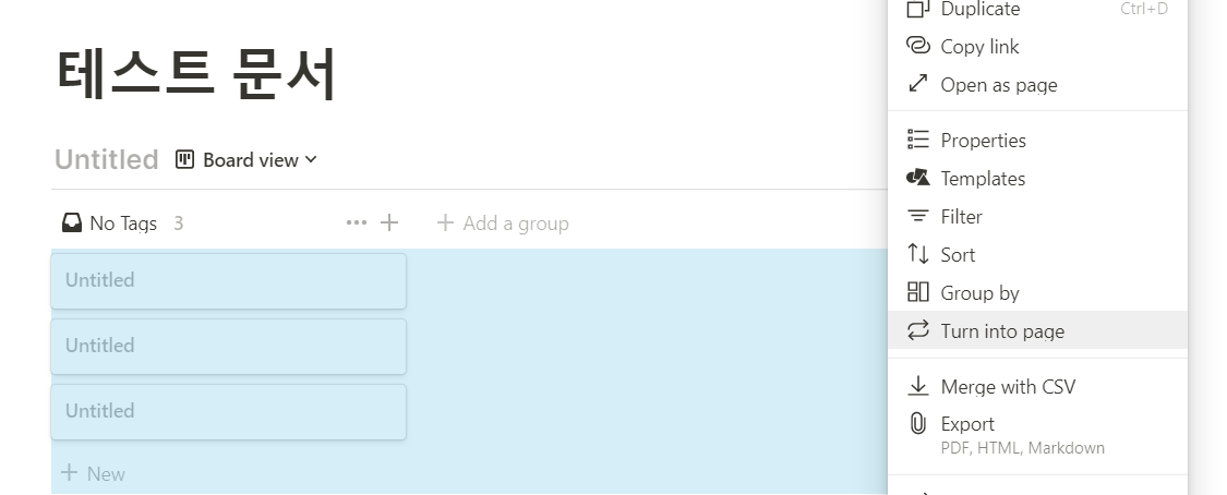 inline 데이터베이스의 경우 우측 점 3개를 눌러 turn into page를 누르면 별도의 페이지로 전환되며