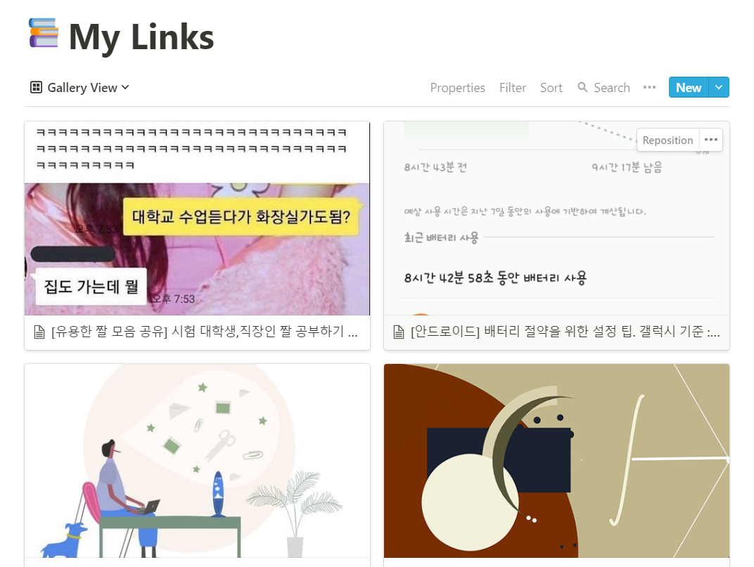 Database를 추가해서 Gallery 뷰로 설정해놓으면 Keep과 거의 판박이 수준.