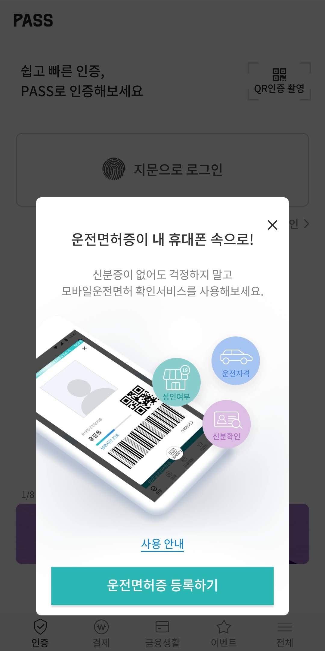 본인확인을 거치면 운전면허증을 촬영해야한다. 기존에 패스 앱에 등록되있는 본인인증 기술을 활용하여 바로 운전면허를 조회해서 등록하는건줄 알았는데 그건 아니더라.