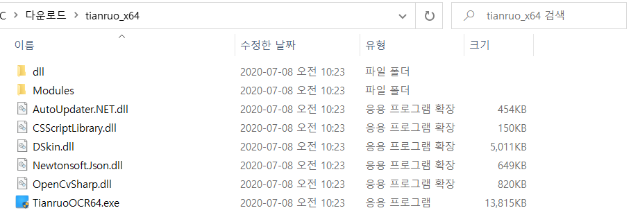 압축을 풀면 이렇게 나온다. Tianruo OCR은 별도의 설치가 필요없는 휴대용 소프트웨어기 때문에, 저 TianruoOCR64.exe 버튼을 누르면 설치 과정 없이 바로 실행이 된다. 중국 컴퓨터 프로그램들은 설치 과정에서 컴퓨터에다가 이상한 짓을 많이 하기 때문에 이 점이 마음에 든다.