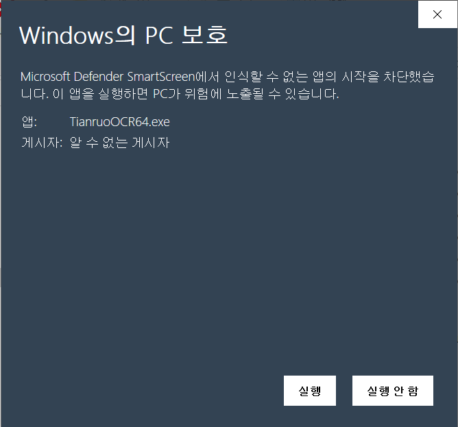 Windows Defender에서 인식할 수 없는 프로그램이라고 하는데...위험을 감지한게 아니라 단순히 인식할 수 없는거라고 하니 그냥 "상세 정보" 눌러서 실행시키면 된다.