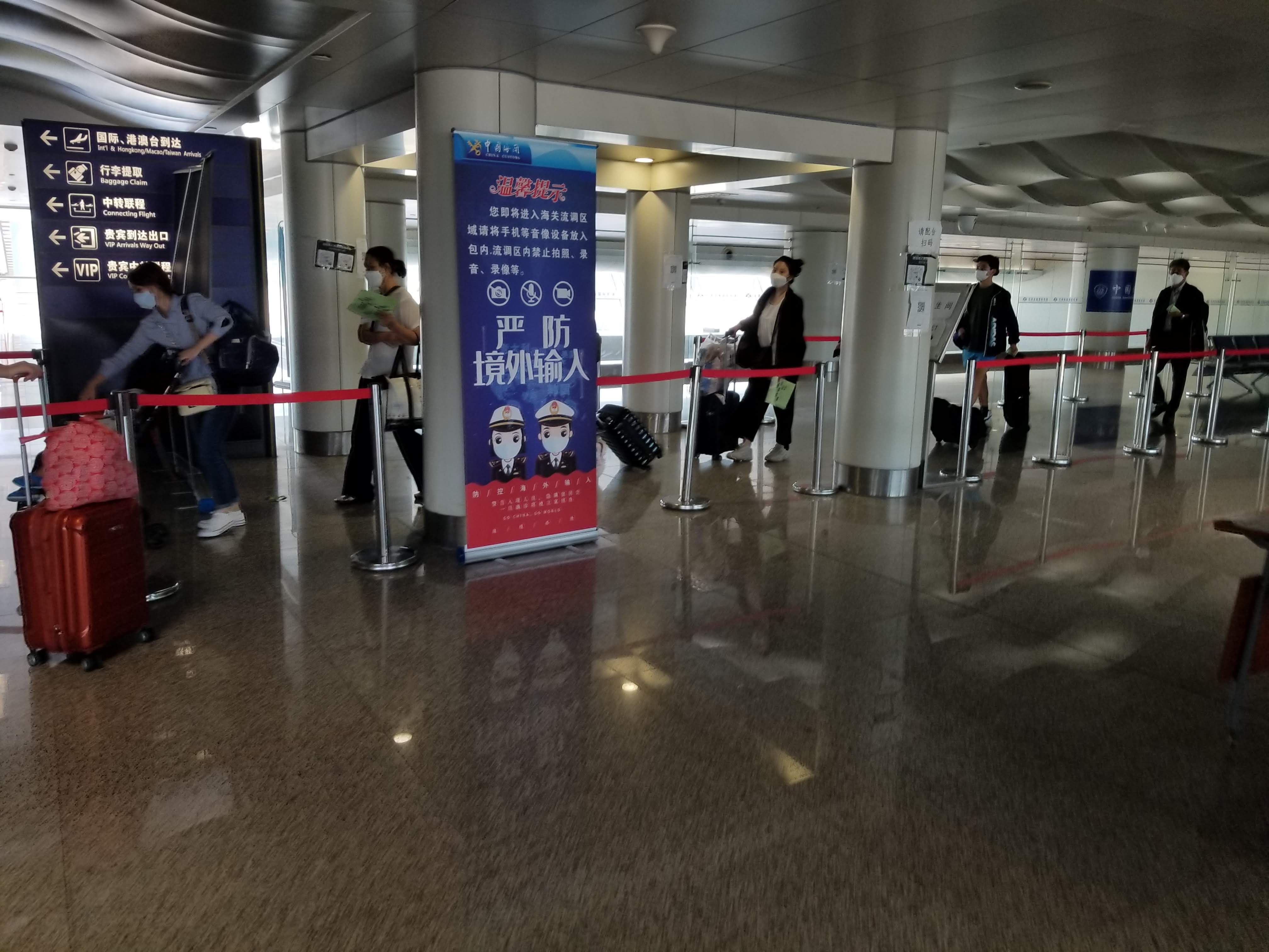 입국심사를 마치면 안내 표지에 따라 윗층으로 올라갑니다. 안쓰는 탑승구역을 봉쇄하여 중국 입국자 대기실로 쓰는 모양이군요. 저 앞에까지 걸어왔다면 테이블에 앉아있는 공항 직원이 보이는데, 초록색 종이를 건네주면 오른쪽 상단에 숫자를 적어줍니다.