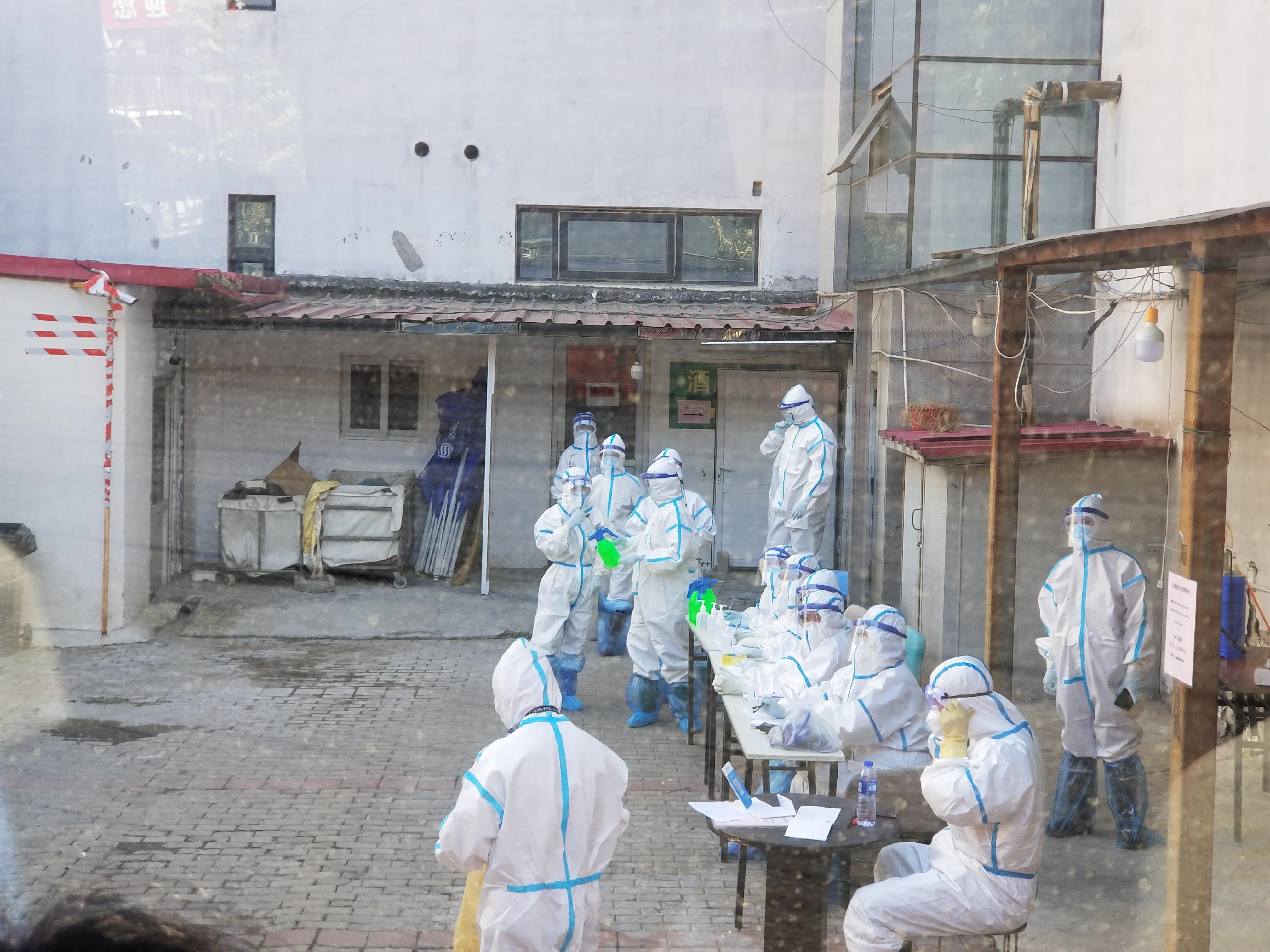 당연하지만 우리는 일반 투숙객이 아닌 관계로 정문으로 들어올 수 없었고 (정문에는 "격리구역 진입금지"라고 누구도 접근하기 싫어지게 붙어있음), 뒷문쪽에 저렇게 방호복을 입은 직원들이 우리를 대기하고 있었습니다. 타 지역 리뷰를 보면 호텔 진입 과정에서 멀리서나마 가족 얼굴을 볼 기회가 있다 뭐 그러는데, 일단 톈진의 격리호텔은 구조상 멀리서라도 보는게 거의 불가능해보입니다.