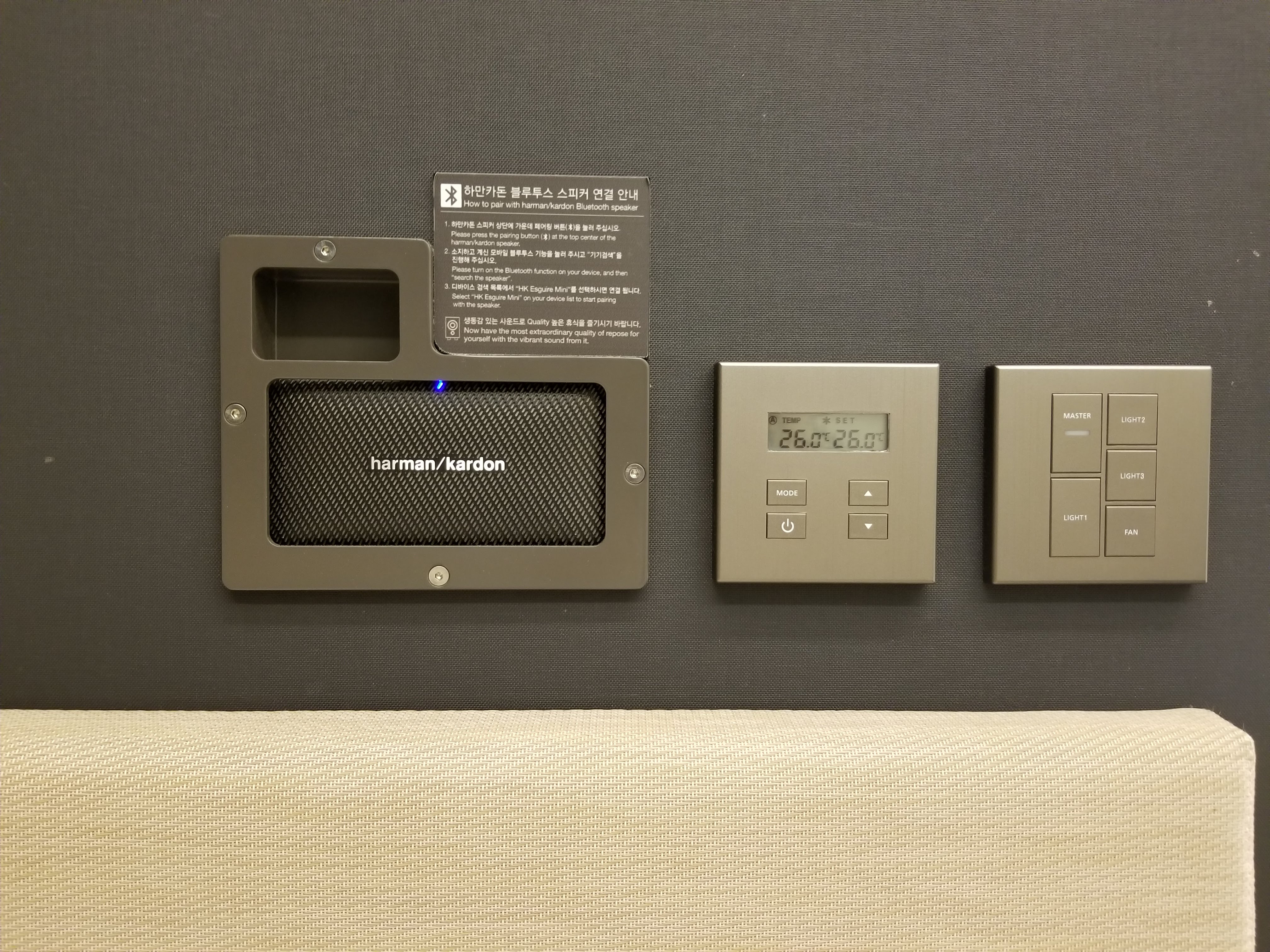 그리고 침대 머리맡에 떡하니 놓여있는 하만카돈 블루투스 스피커...? 브랜드 홍보용인가.