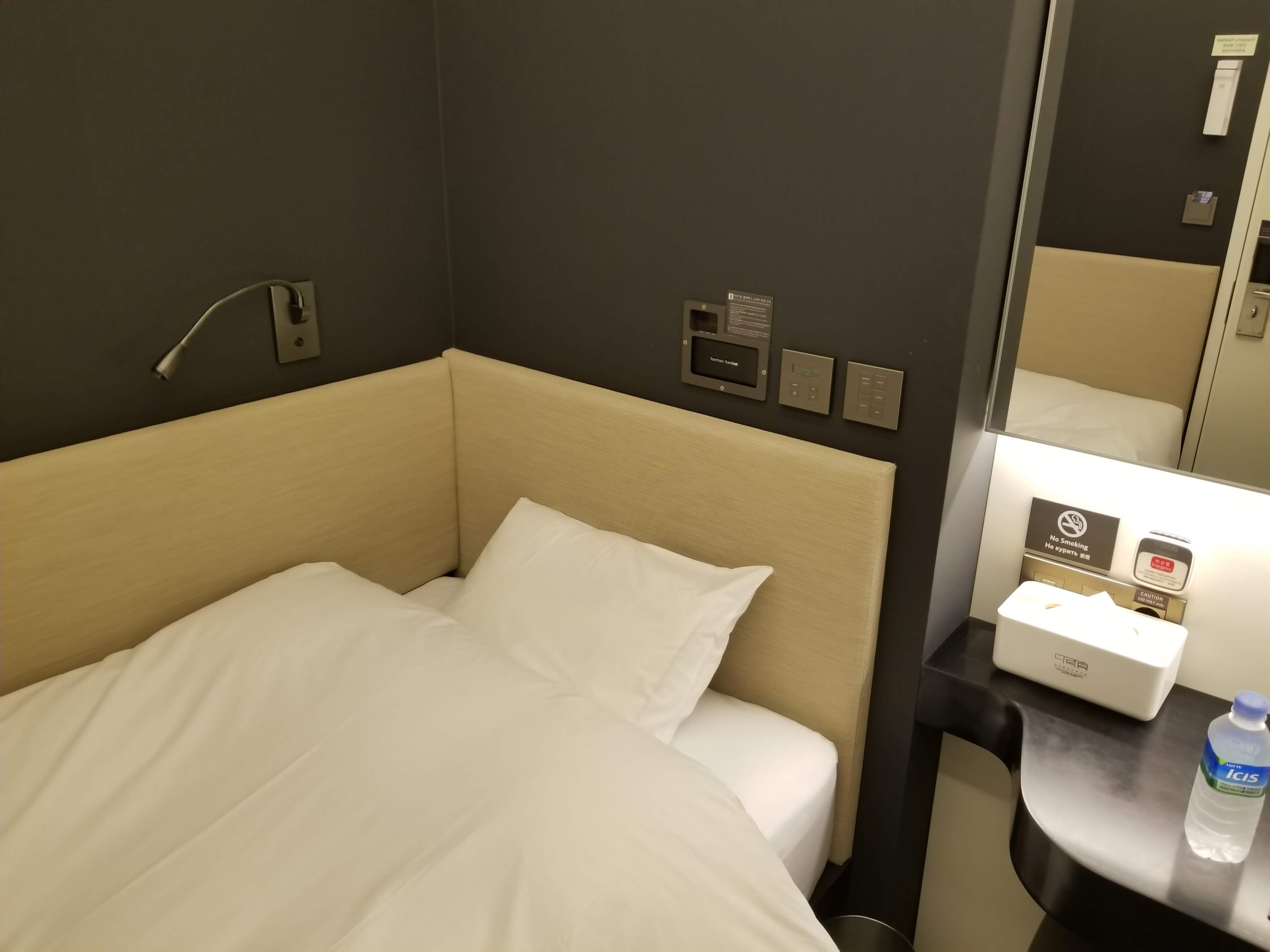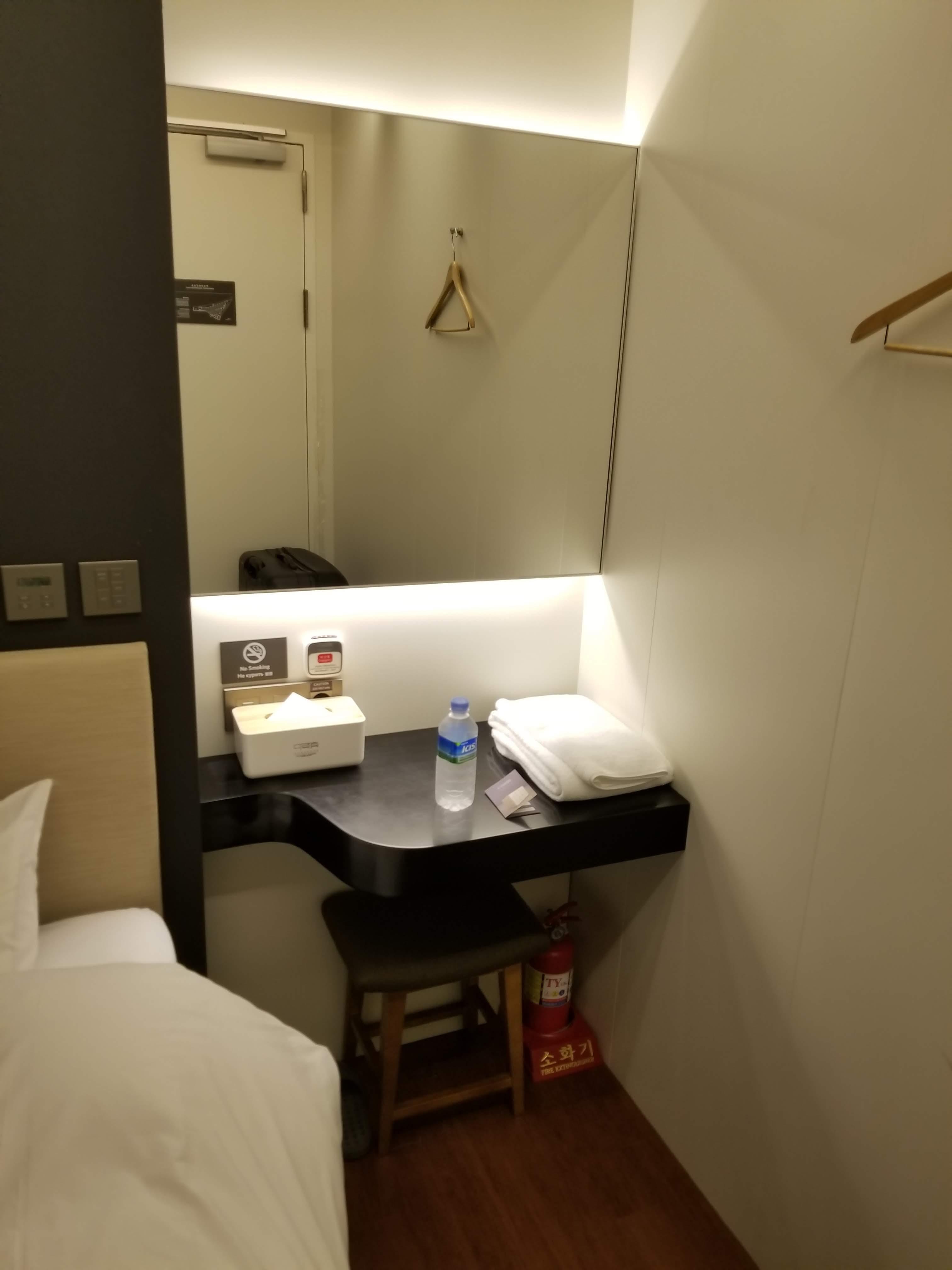 음...일단 첫인상은 "정말 좁다". 고시원에 살아보지는 않았지만 아마 그보다 더 좁을것으로 추정. 그래도 작은 테이블과 의자, 휴지통, 티슈, 수건, 옷걸이, 독서등, 비상손전등, 소화기 등 있을건 다 있었다. 침대도 폭신폭신하니 마음에 들었다.