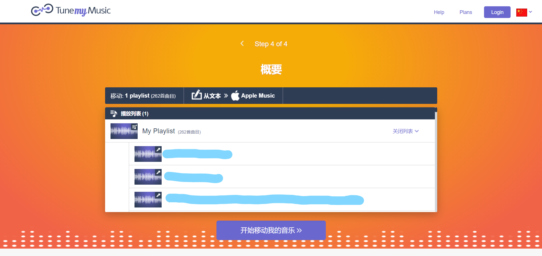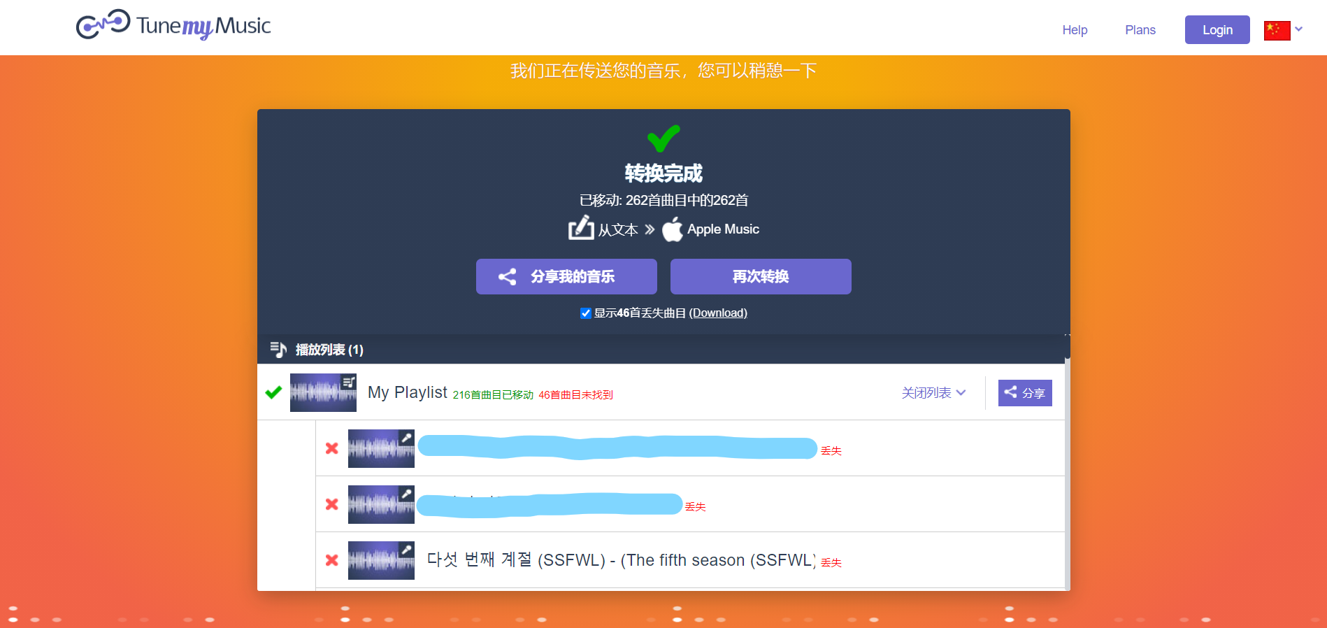 텍스트 인식이 완료되면 开始移动我的音乐(내 음악 이동 시작) 버튼을 누른다. 그러면 알아서 곡 정보를 인식하여 노래들을 자동으로 내 애플뮤직 플레이리스트에 추가시켜준다. 곡의 갯수에 따라 오래 걸릴수도 있다.