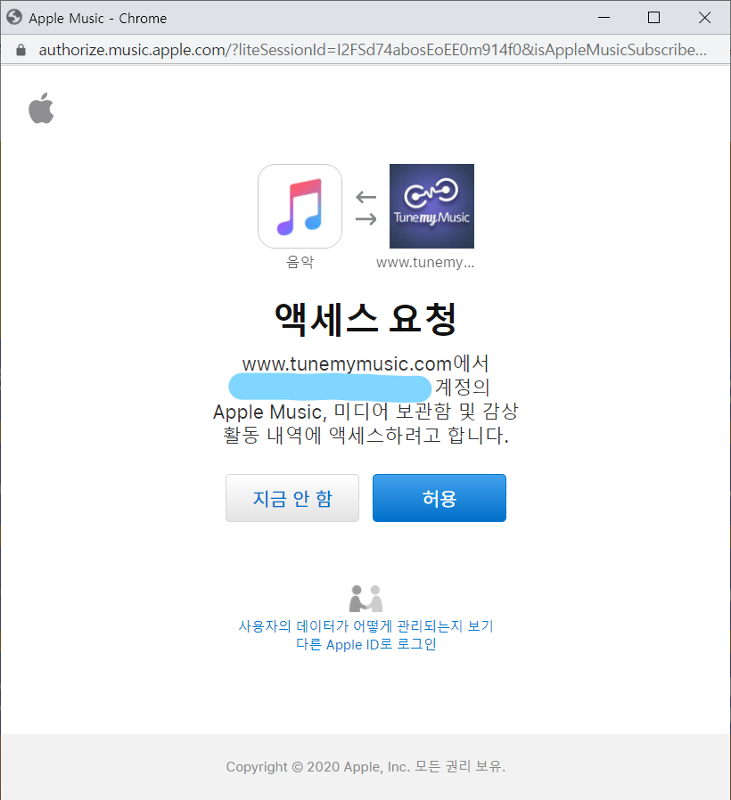 최종 목표는 애플뮤직으로 전환이므로 맨 윗줄 두번째 사과로고를 누른다. 애플뮤직에 로그인 한 다음 액세스 허용을 해준다.