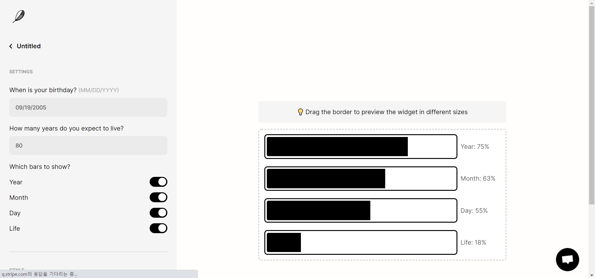 올해, 이번 달, 오늘이 얼마나 남았는지 퍼센트로 알려주는 무서운 위젯. 생일과 원하는 수명을 넣으면 "이번생은 얼마나 남았음"도 알려준다. 동기부여 되라고 만든 위젯같지만 실상은 "에라이 이번달/올해/이번생은 글렀네" 하게 됨.