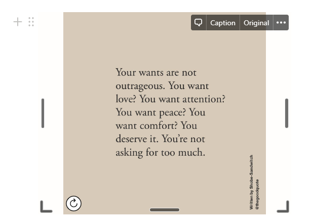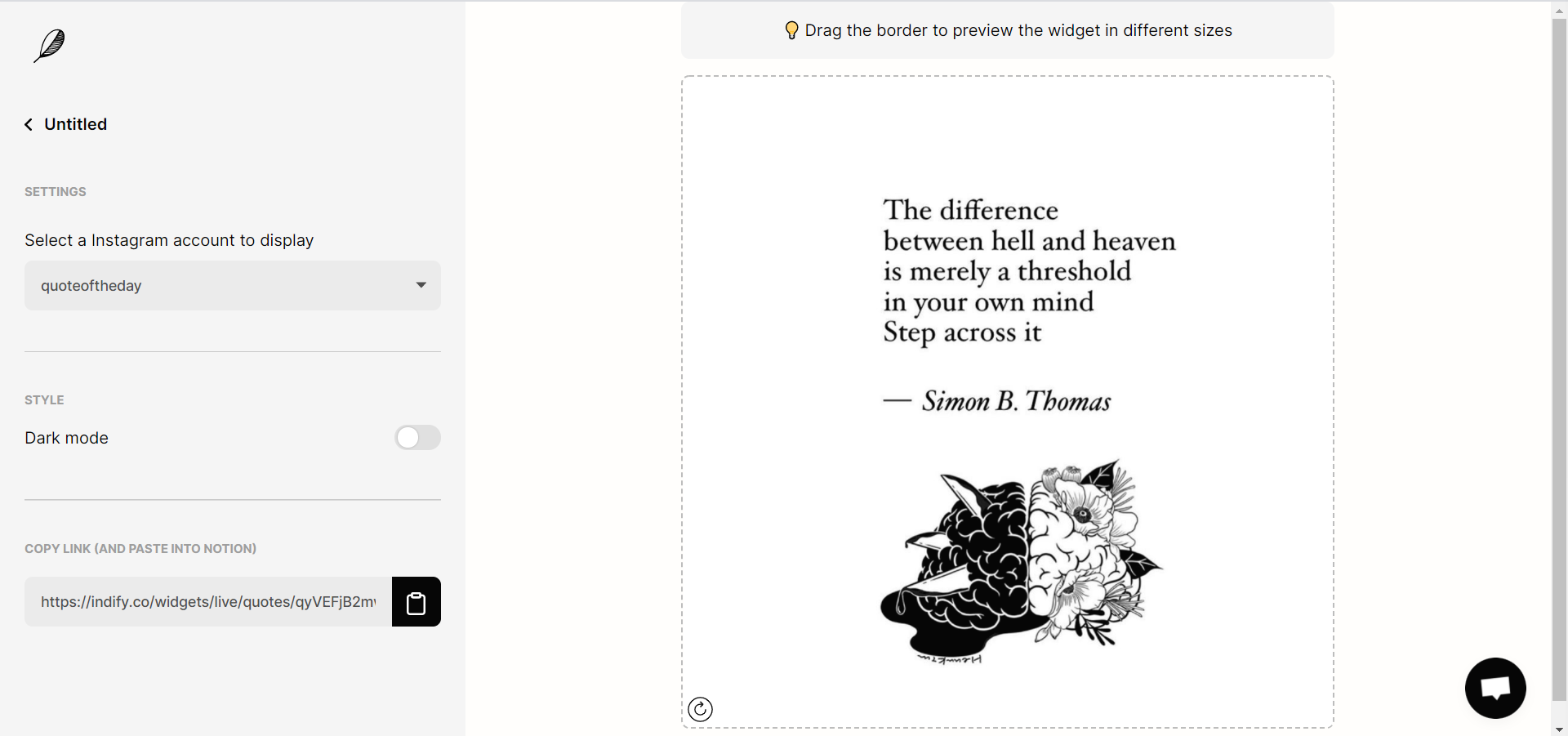 Quotes 위젯은 총 4가지의 디자인이 있는데, Indify에서 따로 제작하는게 아닌 인스타그램에 유명한 글귀 계정에서 그대로 퍼오는 사진이라 여백이 큰 걸 알 수 있다. 하지만 이미 노션의 레이아웃도 여백의 미를 준수하는데...그 결과 PC 기준 2열이나 3열 페이지 한쪽에 놓으면 광활한 여백이 생기고 글씨가 개미 크기로 나온다는 단점이 있다.