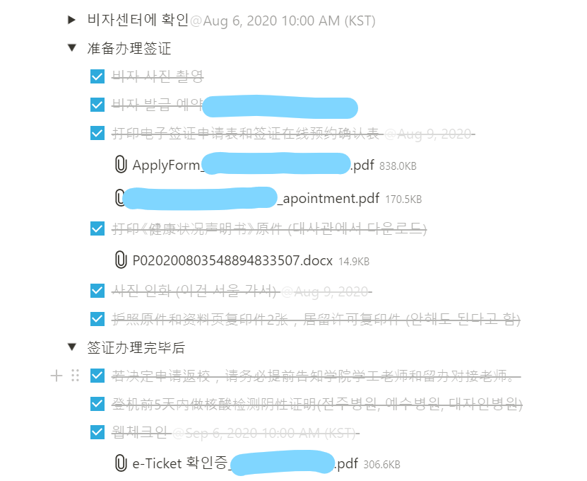 이번에 중국 들어가면서 비자 발급에는 뭐가 필요한지, 핵산검사는 언제 어디서 어떻게 진행해야 하는지, 과사랑 유학생 사무실 측에는 언제 뭘 신청해야 하는지 할 일이 많아 굉장히 혼란스러웠는데, 노션에 페이지를 만들고 인터넷에서 찾은 정보들과 비자신청서, PCR검사지 양식 등 각종 첨부파일들을 한데 정리해놓으니 뭐 하나 빠뜨릴 걱정 없어 편리했다.