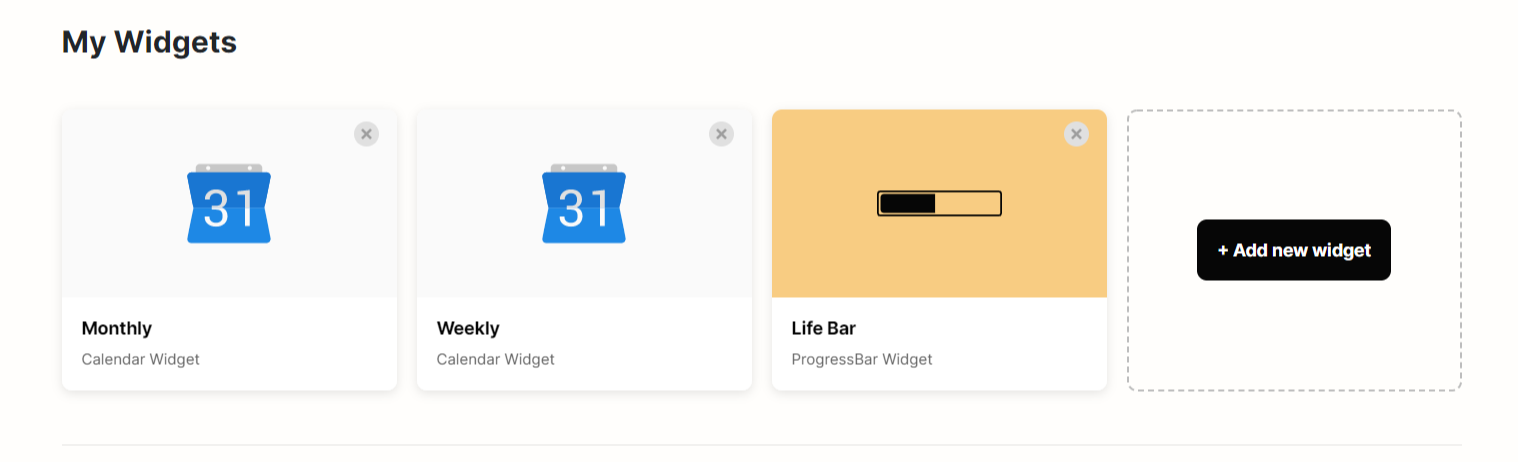 올해, 이번 달, 오늘이 얼마나 남았는지 퍼센트로 알려주는 무서운 위젯. 생일과 원하는 수명을 넣으면 "이번생은 얼마나 남았음"도 알려준다. 동기부여 되라고 만든 위젯같지만 실상은 "에라이 이번달/올해/이번생은 글렀네" 하게 됨.