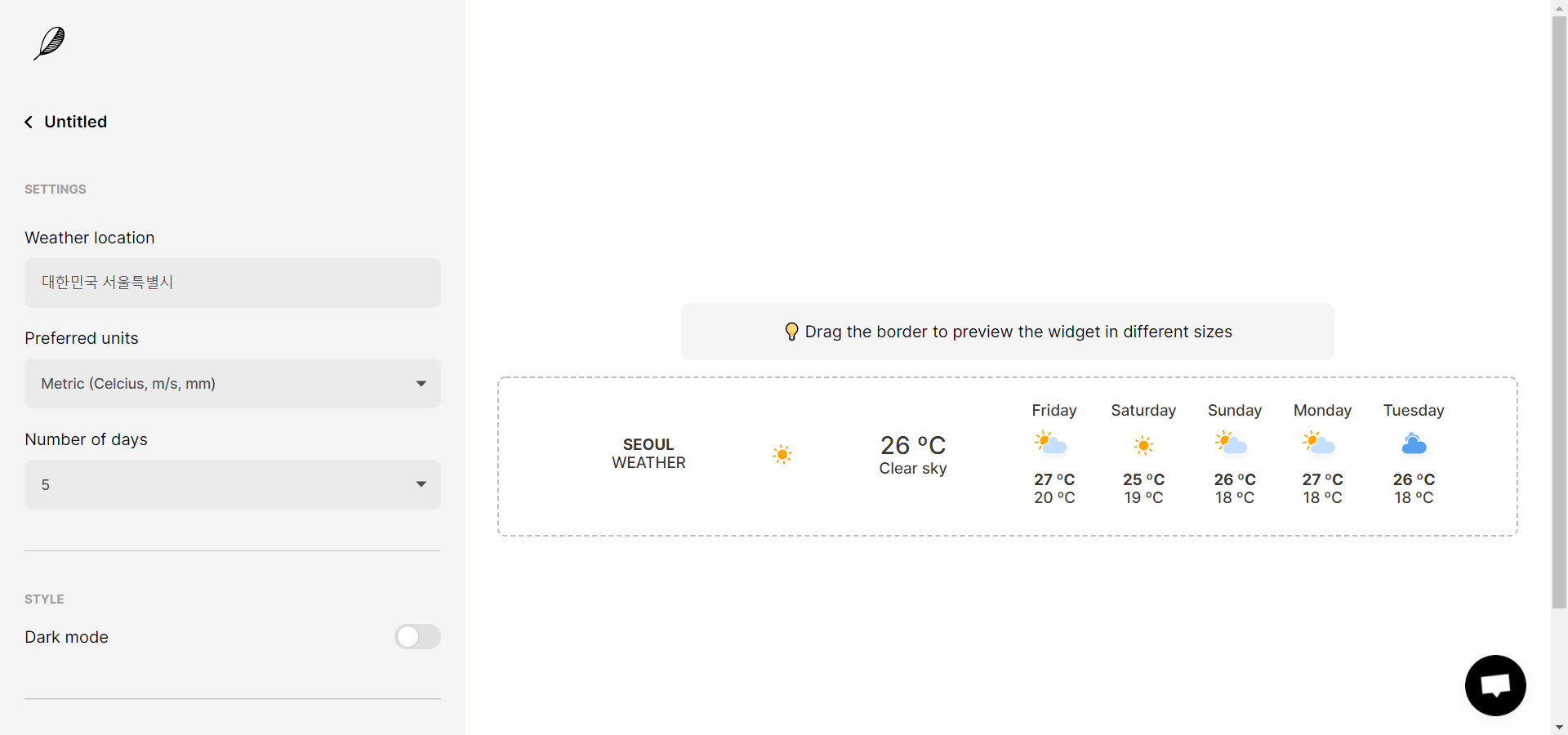 추가하고자 하는 위젯 종류를 눌러 위젯을 생성하면 이런 화면이 나온다. 왼쪽은 위젯 설정 구역, 오른쪽은 미리보기 구역인데, 페이지에 놓을 위치에 따라 크기를 조절할 수 있다.