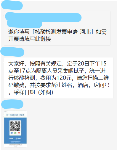 검사는 목(咽拭子)으로만 진행하며(나이쓰!) 공지에 동봉된 QR코드를 스캔하여 이름, 호텔, 방 번호, 날짜를 적고 지불하면 된다고 한다. 비용은 120위안으로 정상 수준. 그나저나 위챗페이나 알리페이가 없는 사람은 어떻게 돈을 내야하는건지 궁금하다.