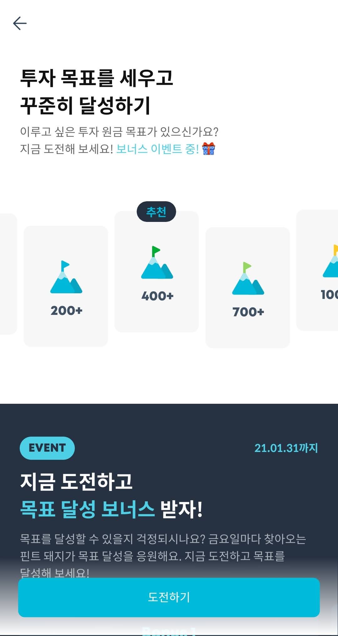 카카오뱅크 26주 챌린지, 동전 모으기 챌린지에 영감을 받았는지 주기적으로 꾸준히 투자하는 기능도 있다. 최근에는 목표 달성 챌린지 이벤트도 개최했다. 하지만 나는 주기적으로 월급받고 투자하는게 아니라서 이건 패스.