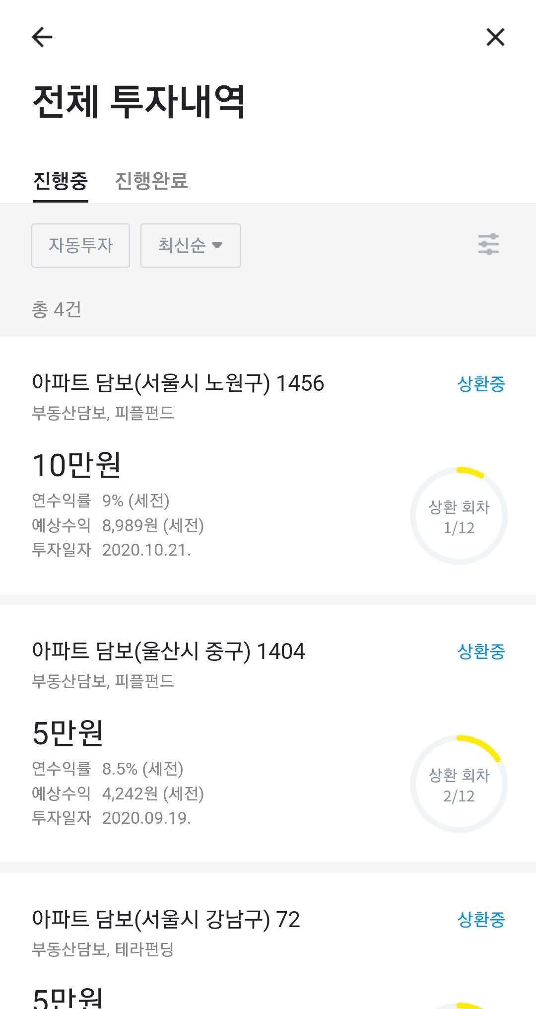 인기가 많은 (일반적으로 안정적이고 수익률이 높은) 상품은 순식간에 매진되버리니 은근 스피드가 필요하다. 귀찮은 사람들을 위한 자동투자 기능도 있는데 멋대로 이상한데다가 투자해버릴까봐 함부로 못써보겠음.