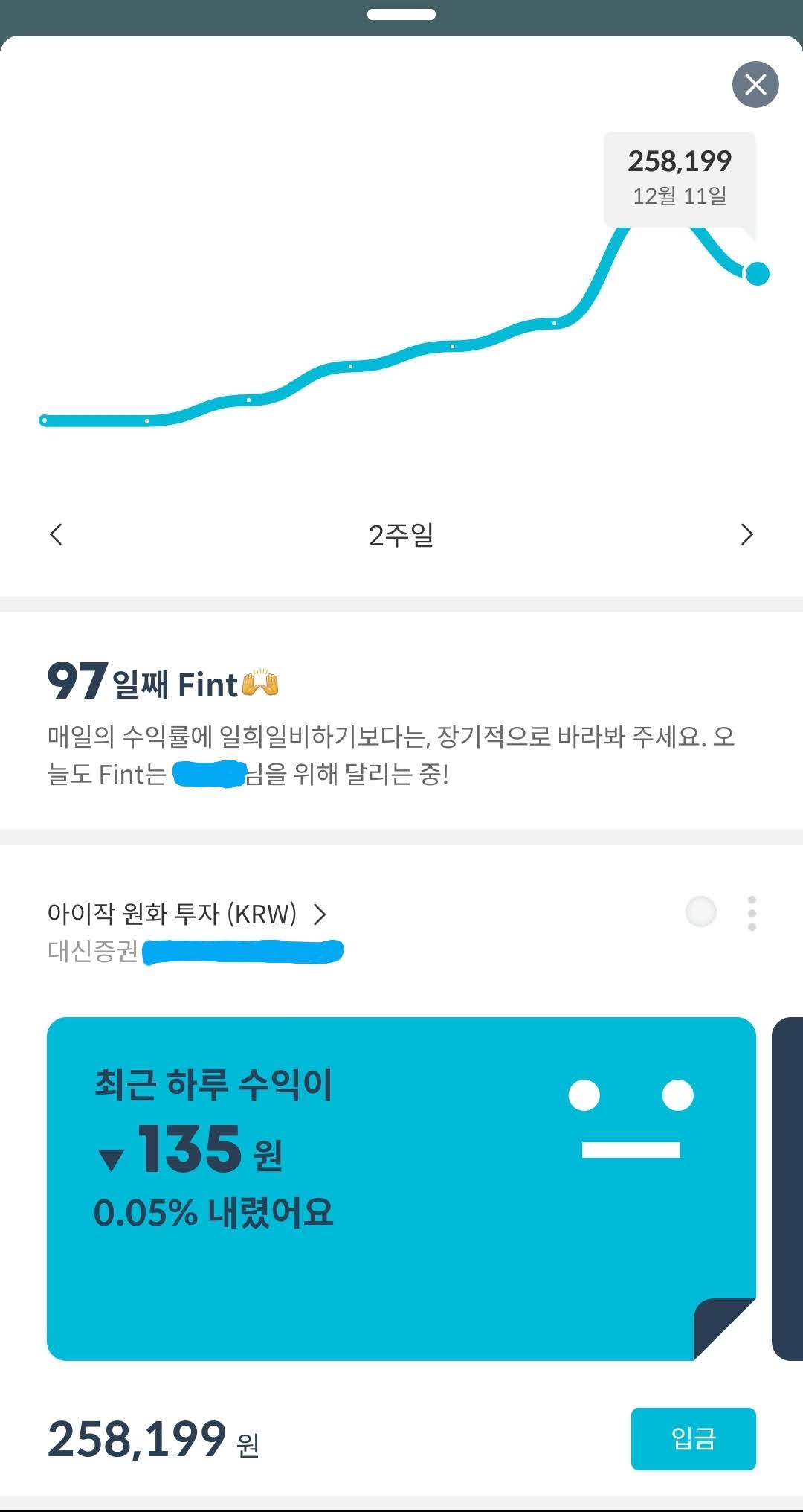 전체적으로 지금까지 사용해본 금융 관련 앱 중에 UI도 제일 깔끔하고, 사용 방법도 직관적이고, 무엇보다 수익률도 (주식 고수에 비하면 쪼렙 수준이지만) 나쁘지 않다. 한가지 아주 사소한 단점이라면 생채인식 등록이 안되서 매번 번거롭게 PIN 입력하고 들어가야하는데 이건 어디다가 피드백을 해야하는지.