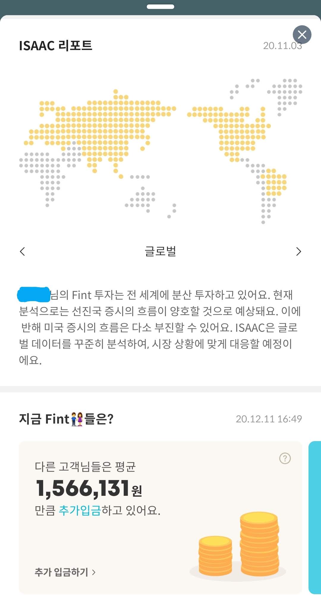 물론 AI라고 해서 진짜 완전히 아무것도 모른채 AI한테 투자를 떠넘기는건 아니고, 실시간으로 투자 포트폴리오를 확인할수도 있고 원한다면 적절하게 투자 비중을 수정하는것도 가능하다. 하지만 다른 핀트 사용 후기글들을 살펴보면 포트폴리오에 손을 댄다고 해도 크게 수익률이 올라가는건 아니고... 그리고 어차피 투자를 할줄도 몰라서 그냥 AI만 전적으로 믿는중.
