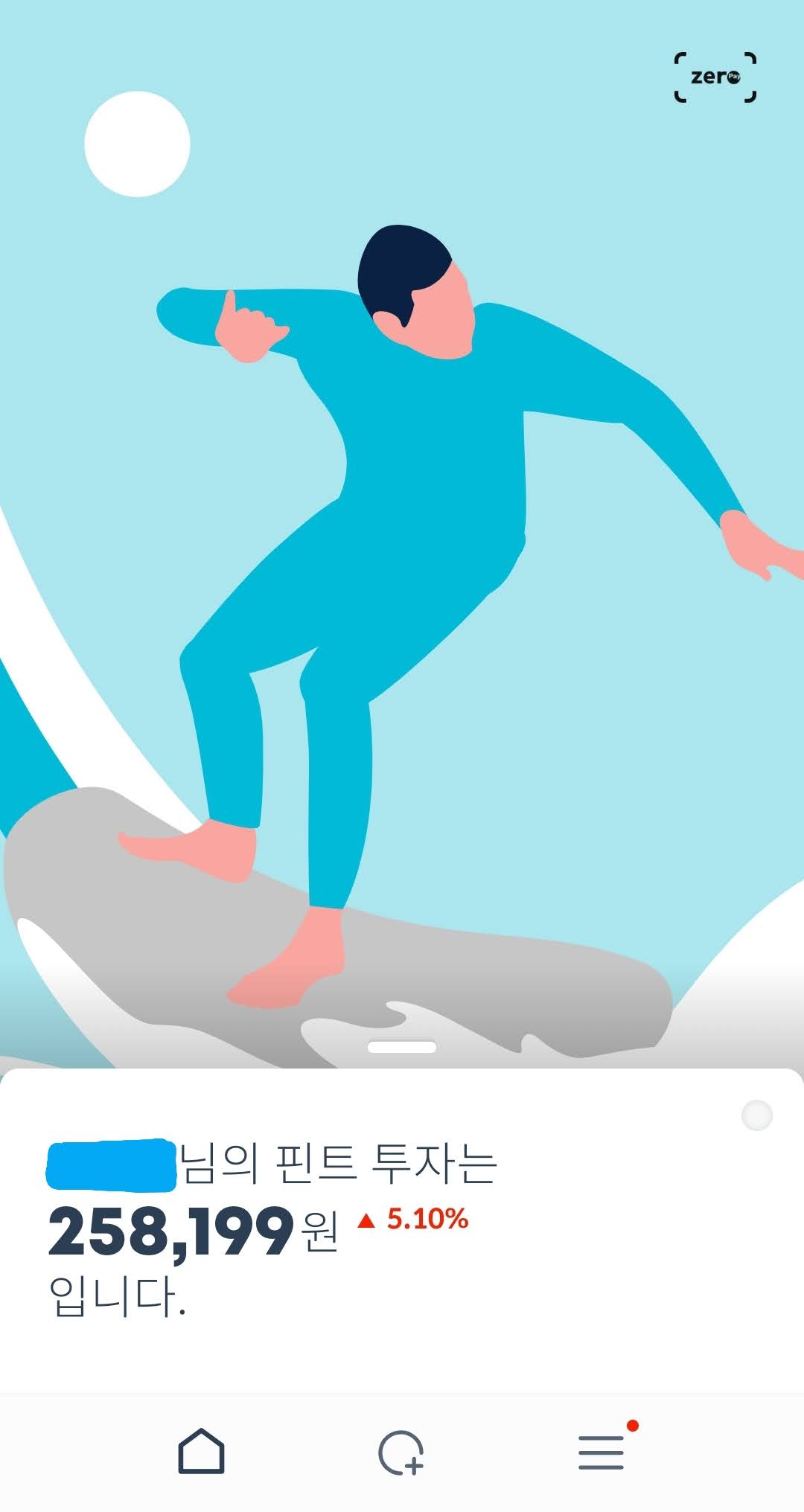 파운트와 비슷하게 내 투자 성향에 따라 인공지능이 알아서 돈을 주식, 원자재 등 금융상품에 투자해주는 서비스다. 파운트의 너저분했단 UI와는 다르게 앱이 전체적으로 굉장히 깔끔하다는 느낌이 드는데, 홈화면에 현재 계좌 잔고와 수익률을 딱 보여주고, 밑으로 내리면 수익률 변동 상황과 자산 운용 현황이 직관적이고 큼직하게 써져있다. (매일의 수익률에 일희일비하기보다는 장기적으로 바라봐달라는 친절한 멘트는 덤.)