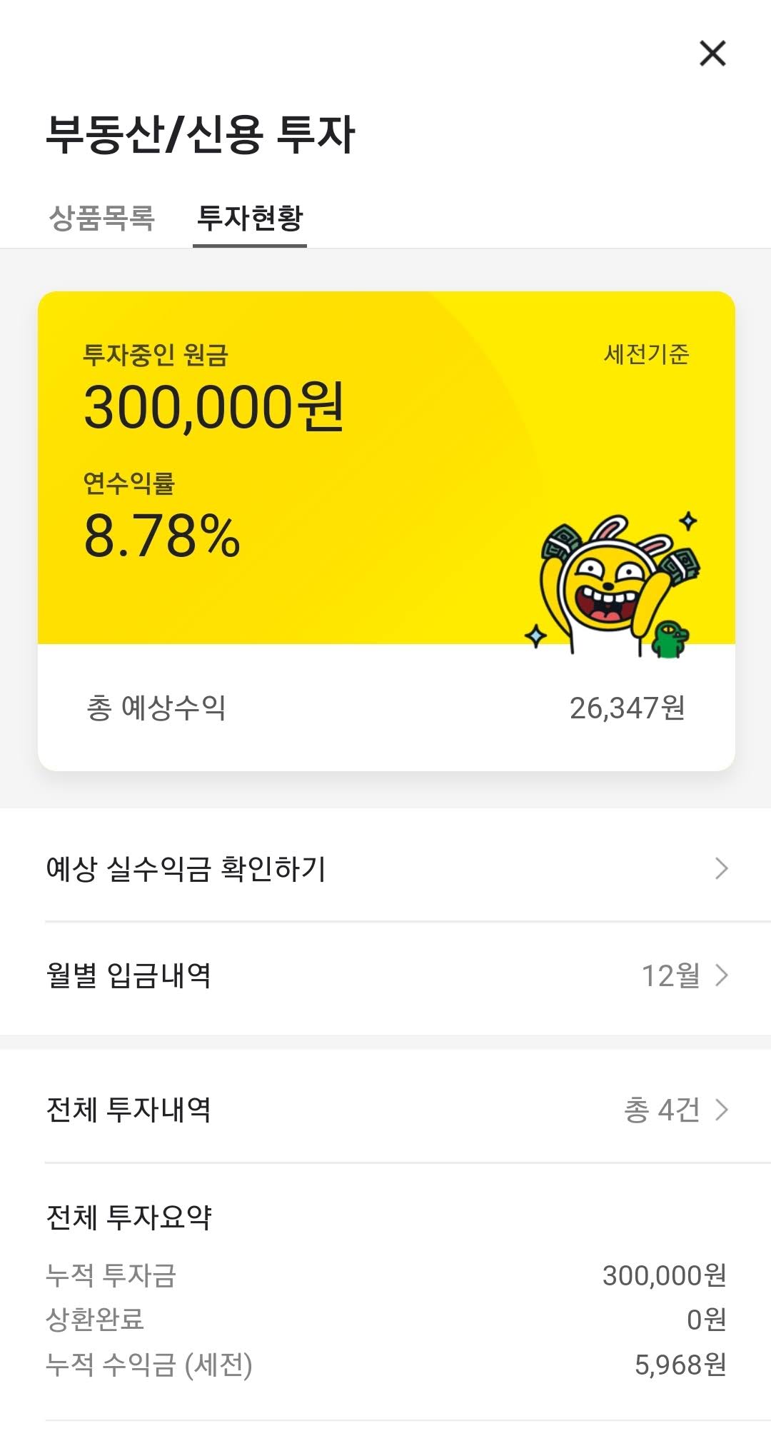 애초에 P2P라는게 수익은 커녕 원금마저도 몽땅 잃을 수 있을 정도로 리스크가 큰 존재이기 때문에 쪼개고 또 쪼개서 투자하는게 좋다. 지금 생각해보니 10만원도 너무 몰빵인듯.
