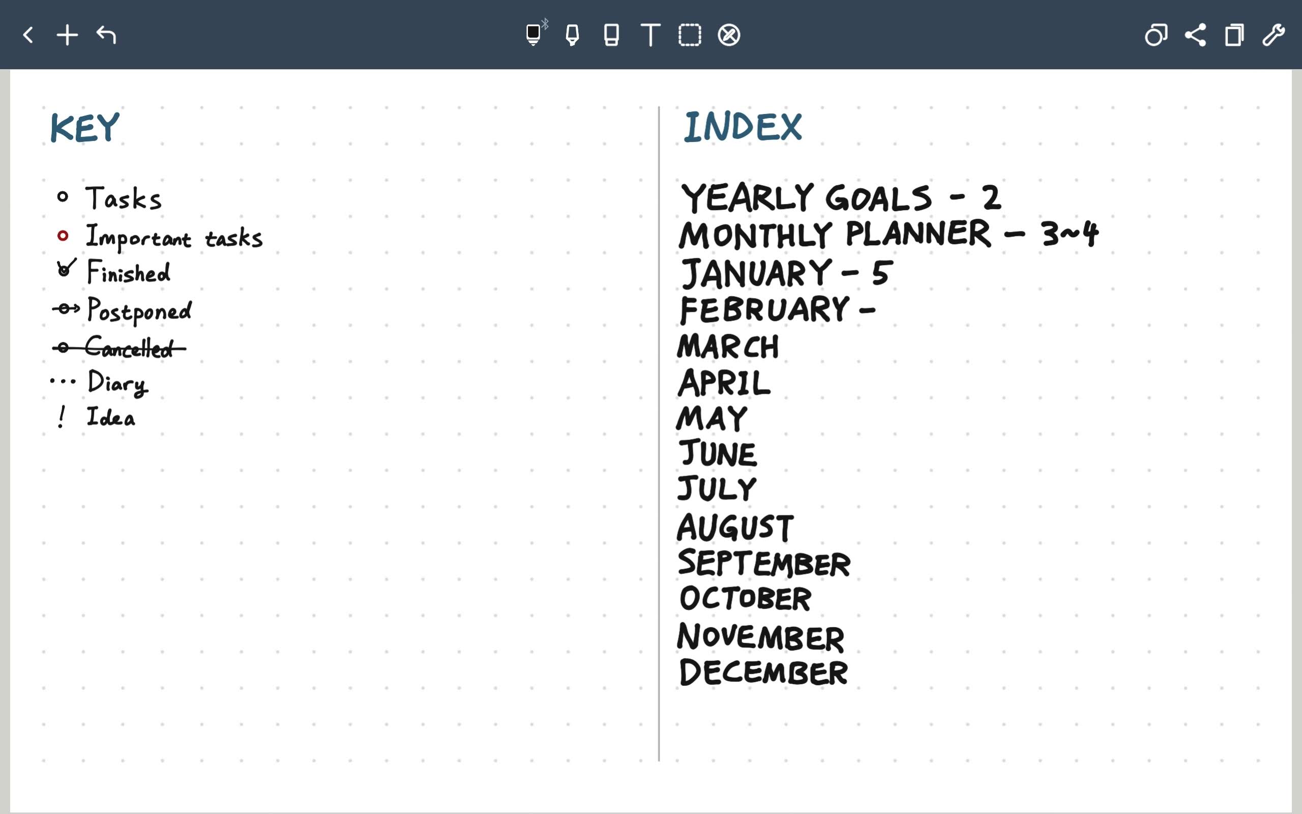 목차의 경우 페이지 구성의 유동성이 높은 불렛저널 특성상 종이공책 불렛저널에게는 매우 중요한 존재지만, 페이지 이동과 삽입이 자유롭고 탐색이 편리한 디지털 불렛저널에도 필요한지는 사실 아직 잘 모르겠다. 마찬가지로 남들은 다 만드니, 그리고 나중에 쓸모가 생길수도 있으니 일단 나도 만들어뒀음.