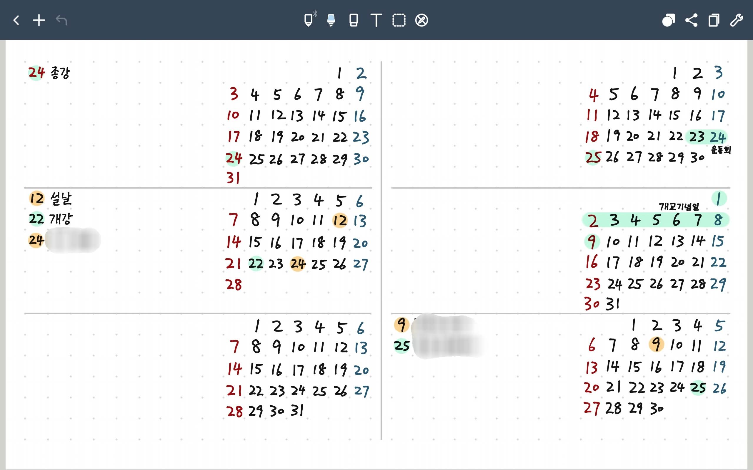 사진처럼 1페이지당 6달치 달력을 그리고, 총 2페이지를 만드니 딱 맞았다.