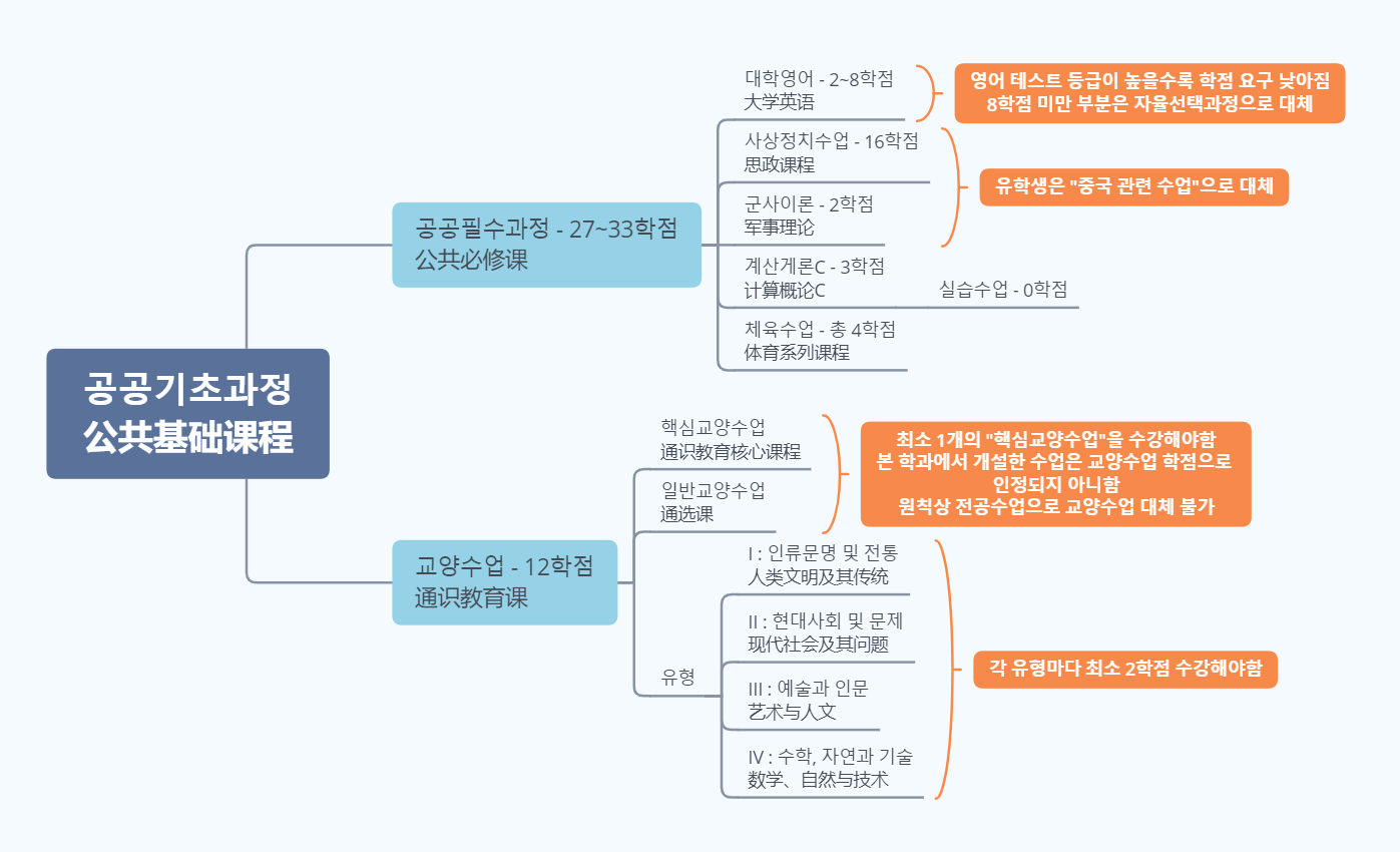 대학영어, 사상정치, 군사이론, 컴퓨터(계산개론), 체육 5가지 수업으로 이뤄져있다. 이 중 유학생이 유의해야 할 부분은: