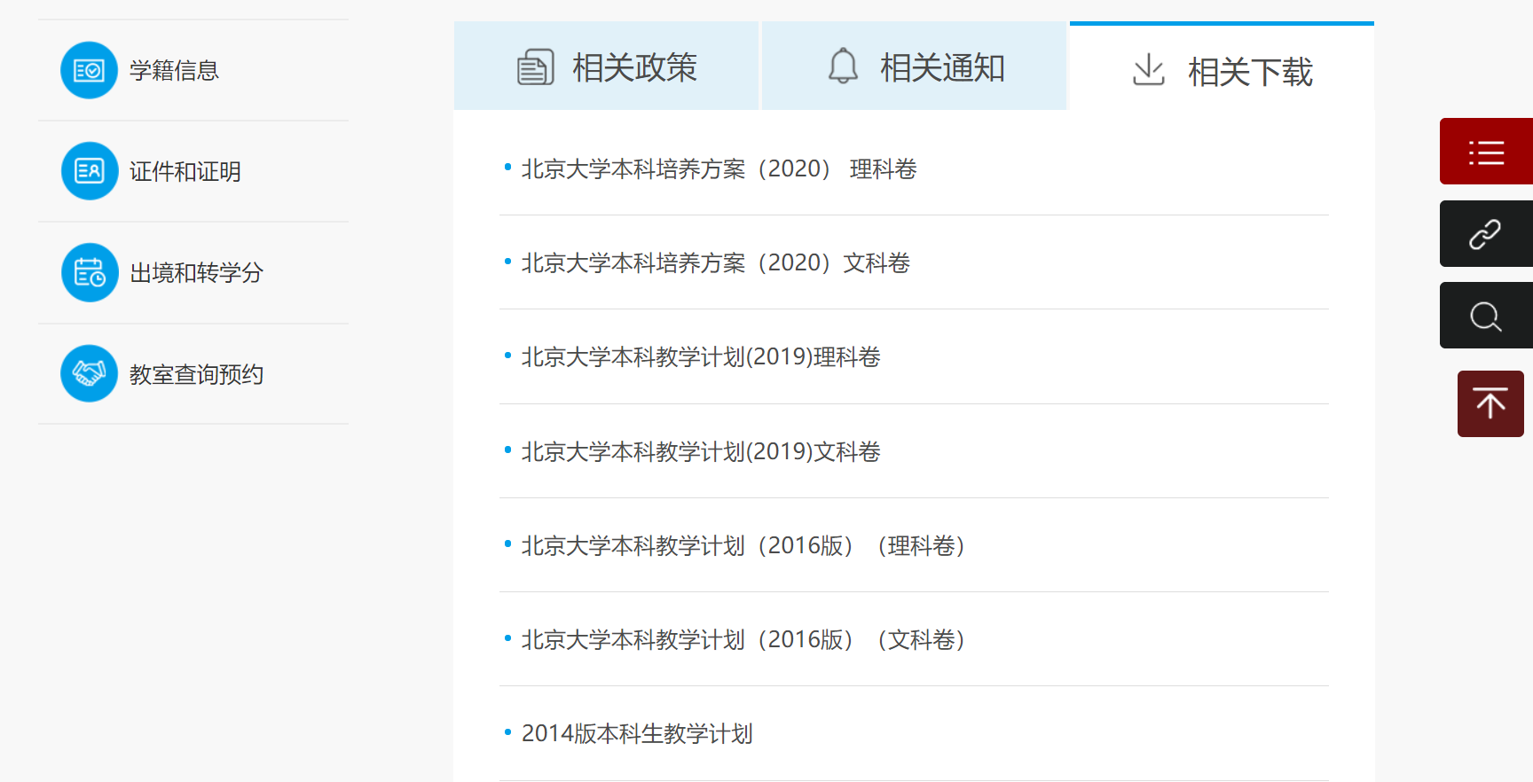 우선 북경대 교무부 홈페이지에 들어가서 学生탭을 누르고 우측 课程和培养-培养方案을 누른다.