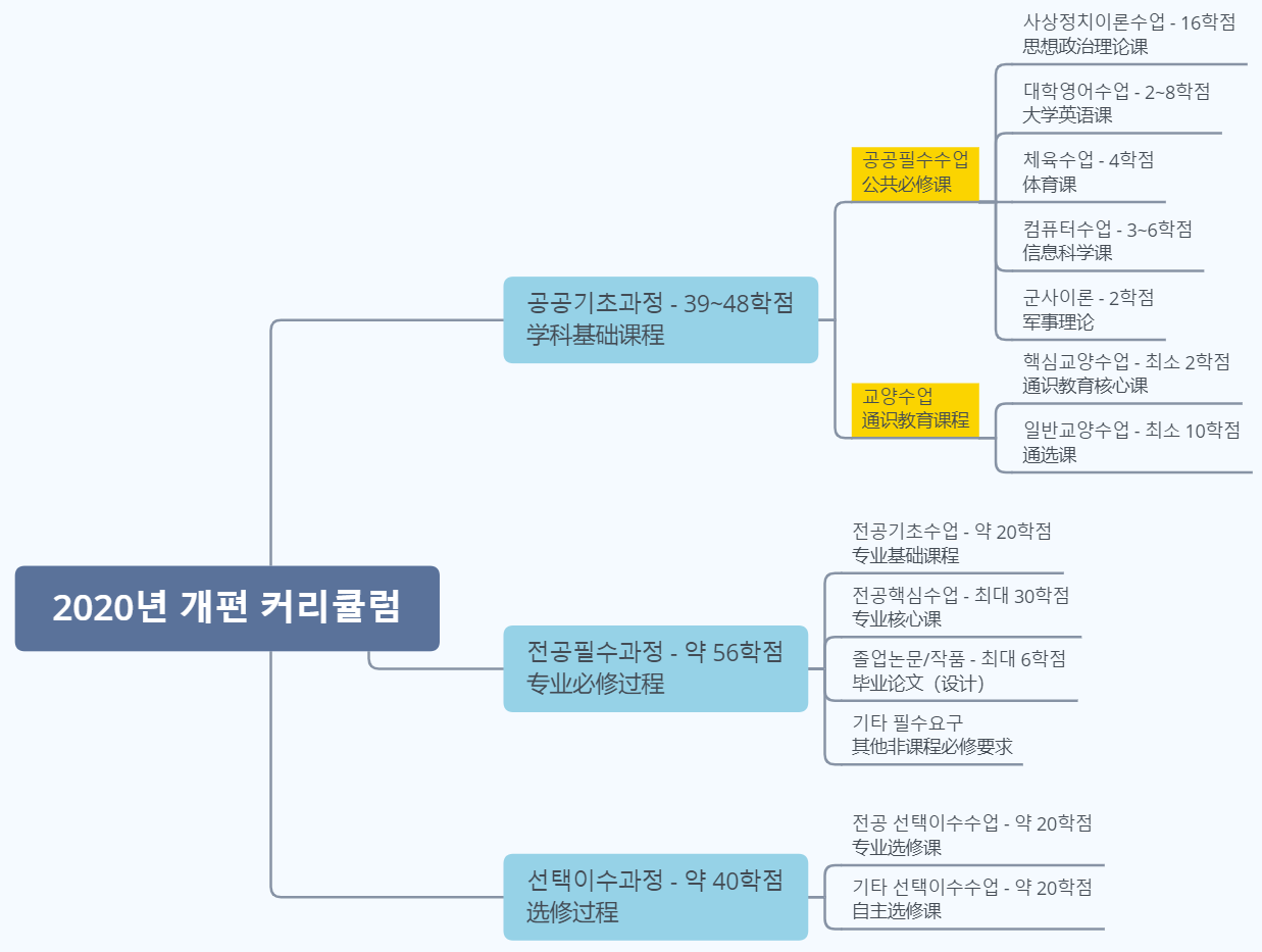 이번 커리큘럼 개편으로 개정된 부분은 크게 두가지인데, 첫째는 "공공기초과정, 핵심과정, 제한이수과정, 교양 및 선택이수과정"이 4가지 파트가 3:2:3:2 비율로 나눠져있던 기본적인 틀이 "공공기초과정, 전공필수과정, 선택이수과정" 3파트로 개편된데다가 학점 배분 가이드라인이 세분화되었고, 둘째는 교양수업의 분류 방법과 이수 규정이 조정되었다. 개정된 방안은 아래 마인드맵과 같다.