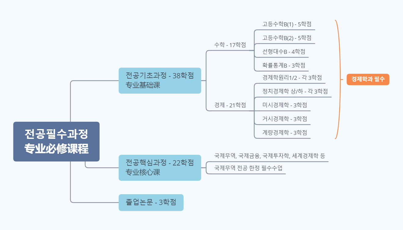 본문에서는 경제학과에서 유학생들이 가장 많이 선택한다는 국제경제 및 무역(国际经济与贸易)(이하 국제무역) 전공의 커리큘럼을 예시로 설명할텐데, 북경대의 모든 학과가 이와 완전히 똑같거나 크게 비슷할거라는 보장은 하지 않는다.