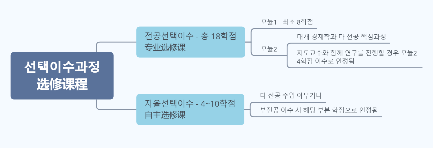 전공선택과정은 학과마다 다소 차이가 존재하는데, 국제무역 전공의 경우 총 18학점을 이수해야 하며, 국제무역과 관련된 선택과목 중 최소 8학점을 채워야하는 모듈1과 경제학과 내 타 전공 수업 등으로 이뤄진 모듈2로 이뤄져있다. 수업 리스트가 많이 긴 관계로 일부만 캡쳐해서 올렸다.